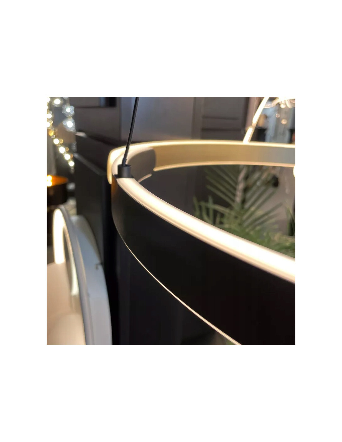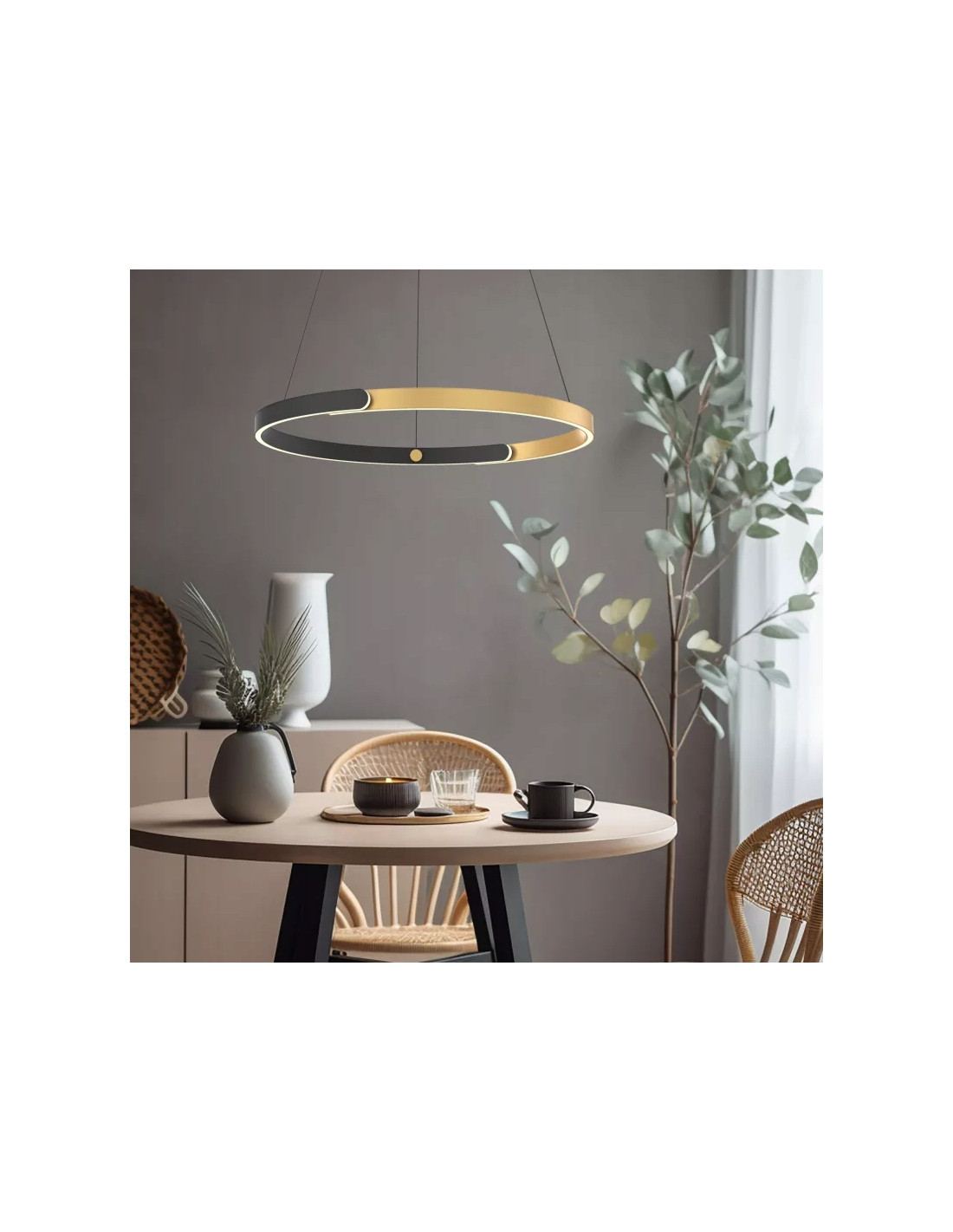 Geometryczny stelaż o średnicy 51,5 cm z niewielką podsufitką, podtrzymywany na linkach, sprawia, że lampa wydaje się lekka i eteryczna. Jej nowoczesna forma idealnie wpisuje się zarówno w gabinetach i biurach, jak i w jadalniach, korytarzach, kuchniach, salonach oraz sypialniach. Dzięki temu lampa jest niezwykle uniwersalna i sprawdzi się w różnych aranżacjach wnętrz.