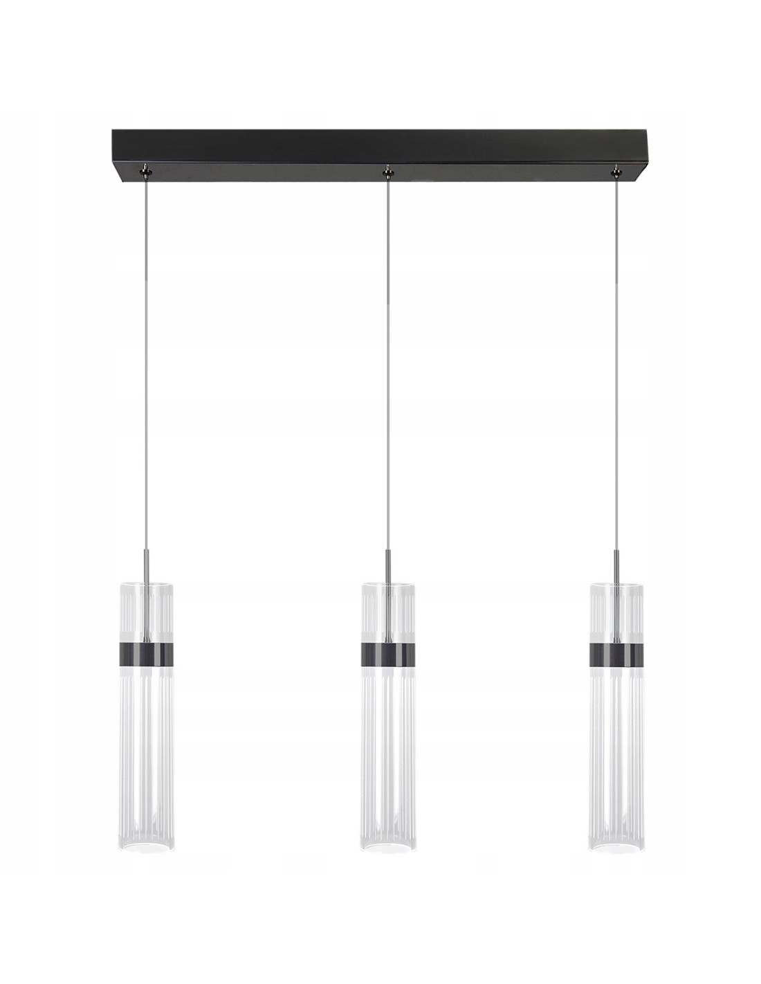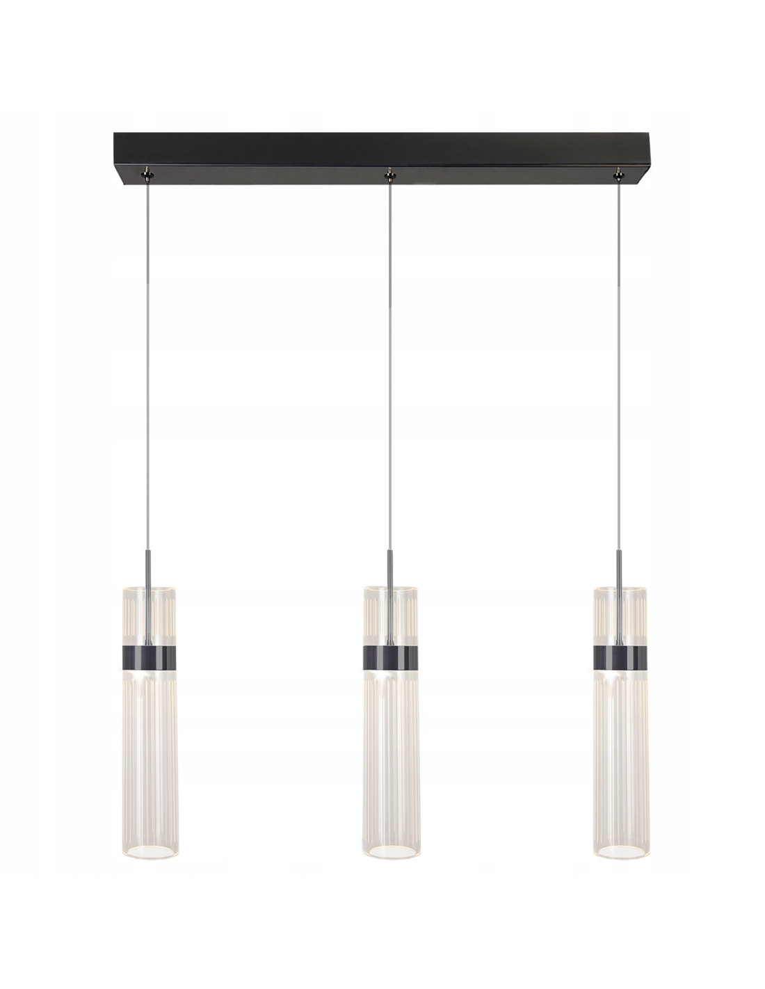 Posiada trzy smukłe klosze, które wykonane są z transparentnego akrylu, dodają one lekkości i finezji całej konstrukcji. Każdy klosz otoczony jest metalowymi obręczami w kolorze różowego złota, co wzbogaca cały projekt i nadaje mu wyjątkowego charakteru. W połączeniu z czarną kolorystyką lampy, tworzą harmonijną całość, która przyciąga wzrok.