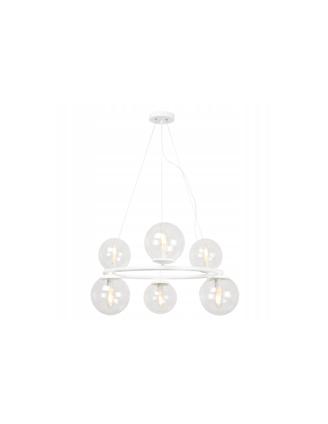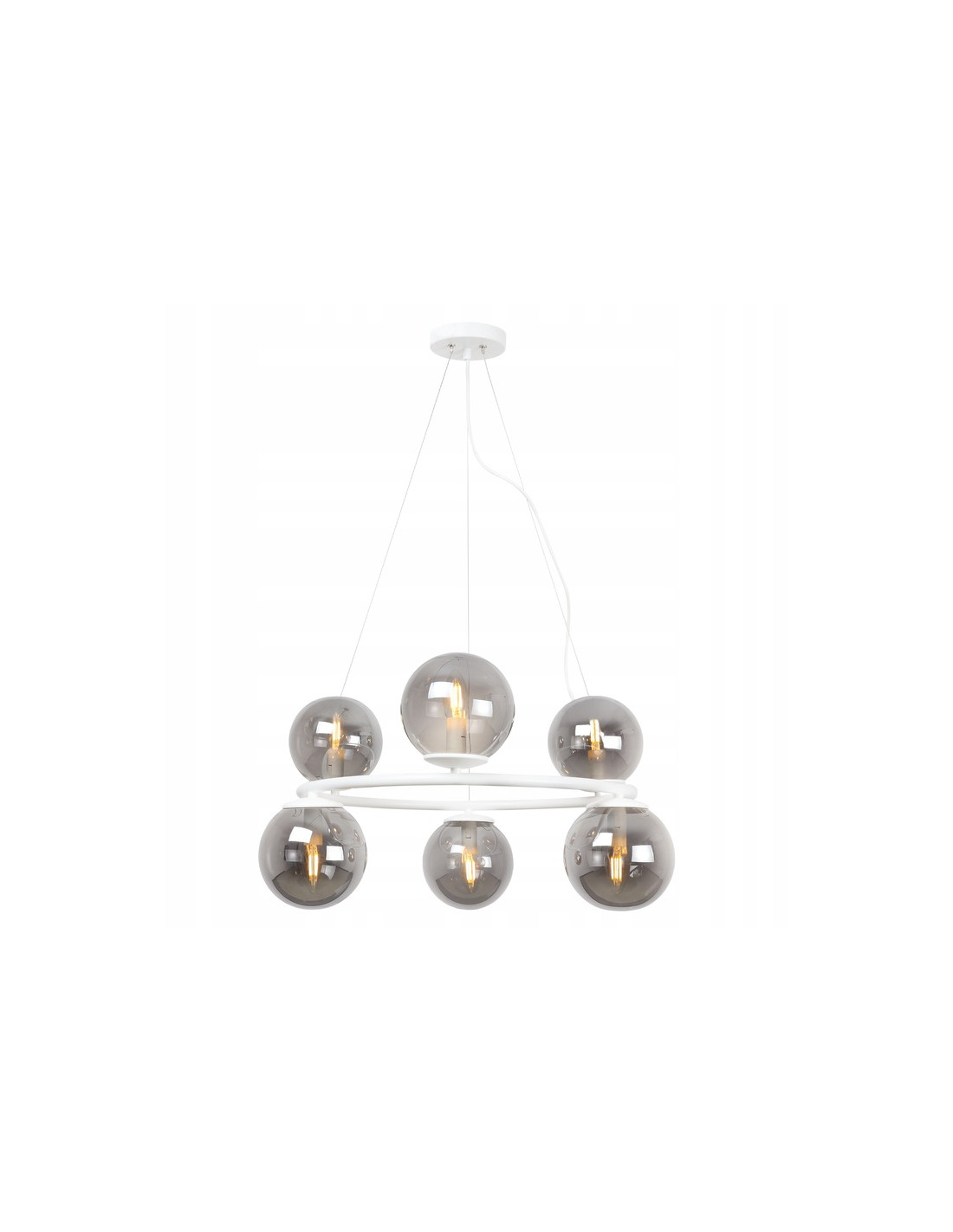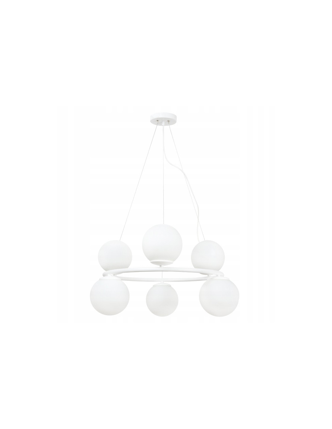 Lampa AURA charakteryzuje się metalowym stelażem w kolorze białym oraz szklanymi kloszami w kształcie kul, które doskonale rozpraszają światło, tworząc przytulną atmosferę. Dzięki regulowanej długości przewodów masz możliwość dostosowania jej wysokości do swoich potrzeb, co sprawia, że lampa może być umieszczona w różnych pomieszczeniach.
