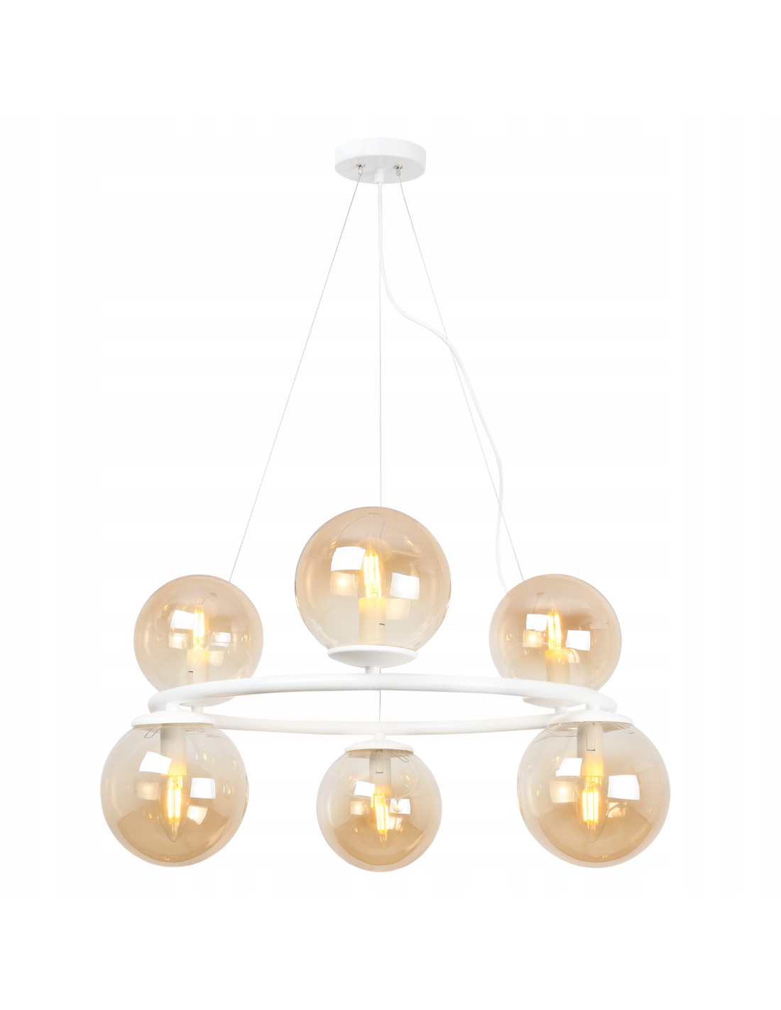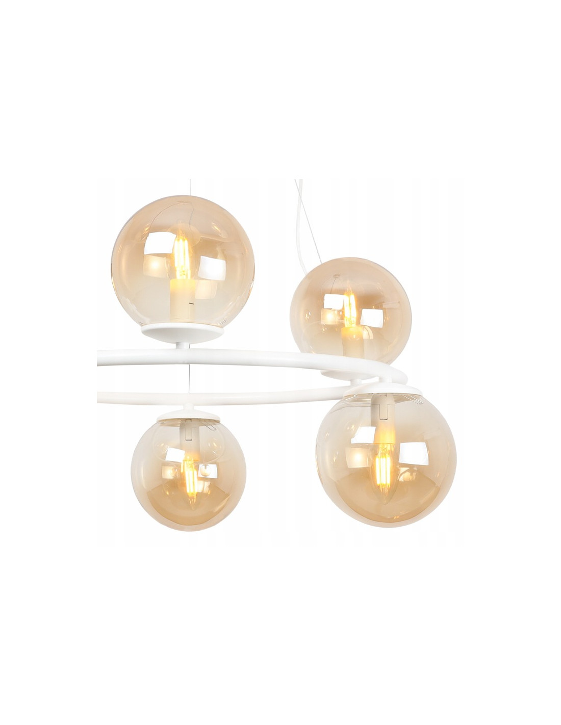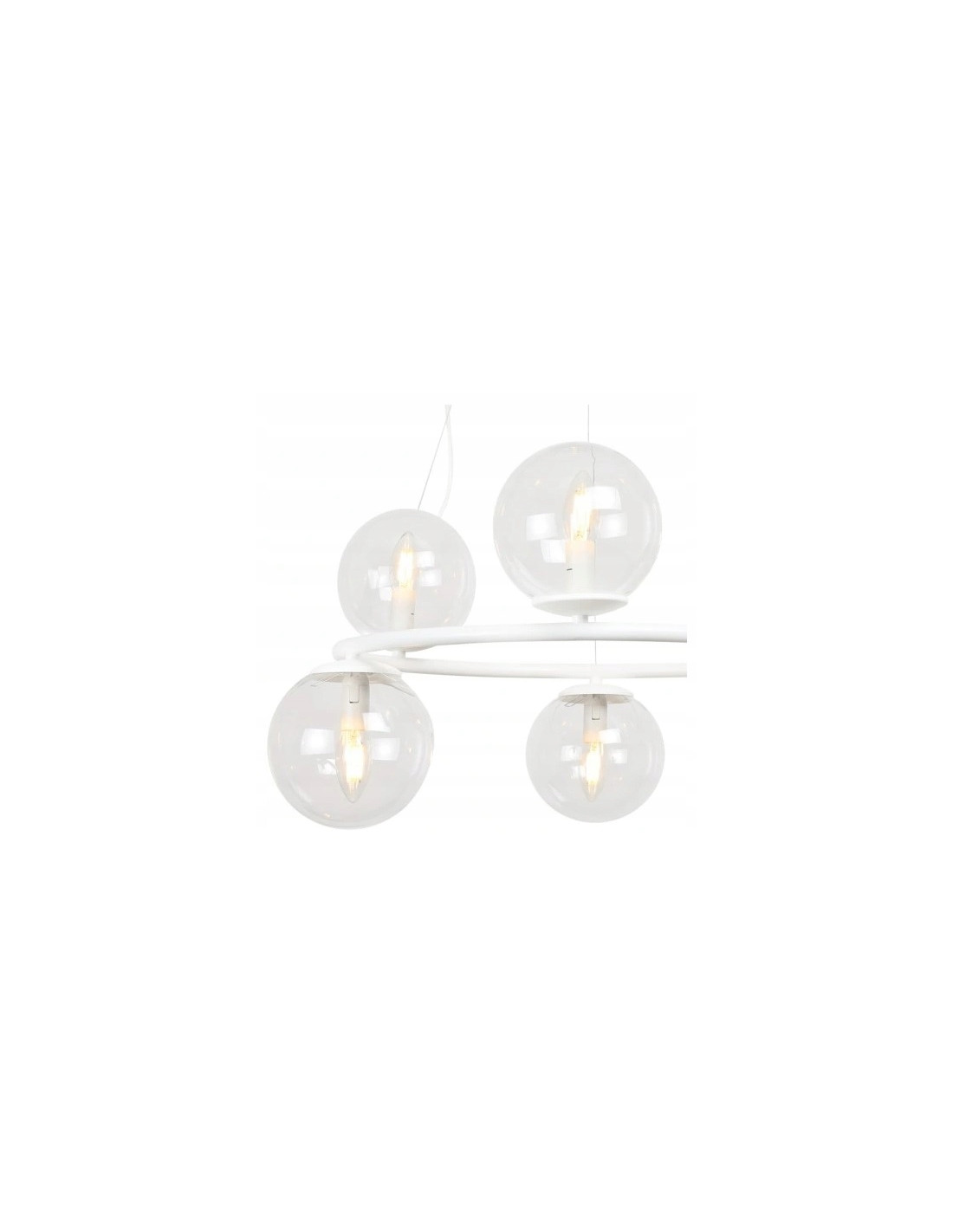 Lampa AURA charakteryzuje się metalowym stelażem w kolorze białym oraz szklanymi kloszami w kształcie kul, które doskonale rozpraszają światło, tworząc przytulną atmosferę. Dzięki regulowanej długości przewodów masz możliwość dostosowania jej wysokości do swoich potrzeb, co sprawia, że lampa może być umieszczona w różnych pomieszczeniach.
