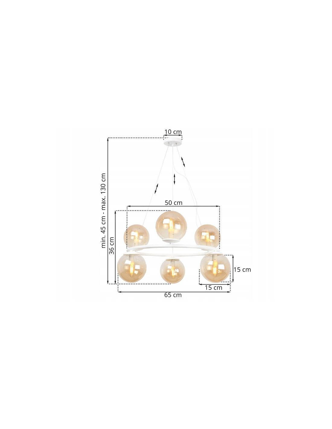 Warto zwrócić uwagę na sześć punktów świetlnych, które pozwalają na użycie żarówek z gwintem E14 o maksymalnej mocy 60W. Lampa AURA to doskonały wybór do oświetlenia dużych przestrzeni, takich jak stół w jadalni, wyspa w kuchni czy przestrzeń nad kanapą w salonie. Dzięki swoim wymiarom – średnica 65 cm – zachwyca zarówno rozmiarem, jak i elegancją.
