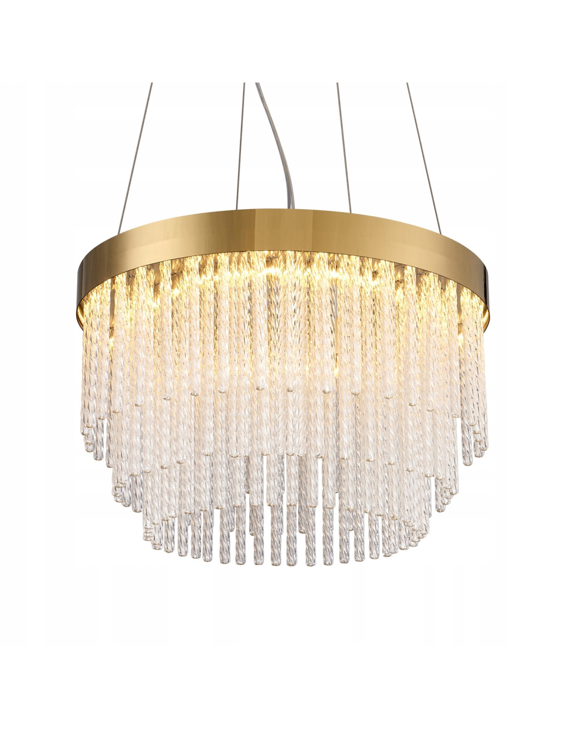 Piękna lampa tortowa szklane transparentne pałeczki GLORIA to ponadczasowy element, który doskonale uzupełni każde wnętrze. Stworzona z myślą o elegancji i nowoczesnym designie, ta ekskluzywna lampa wisząca łączy w sobie wysmakowaną estetykę oraz funkcjonalność. Jej nowoczesny, okrągły pierścień ze szlachetnego, polerowanego złota tworzy solidną i efektowną bazę dla całej konstrukcji, co sprawia, że lampa staje się centralnym punktem każdego pomieszczenia.