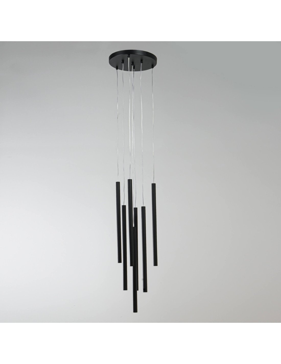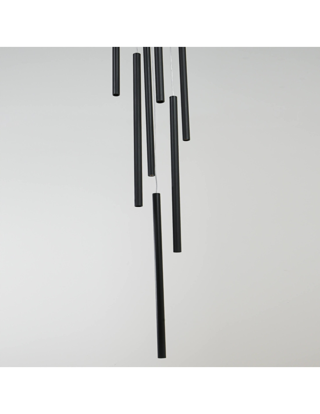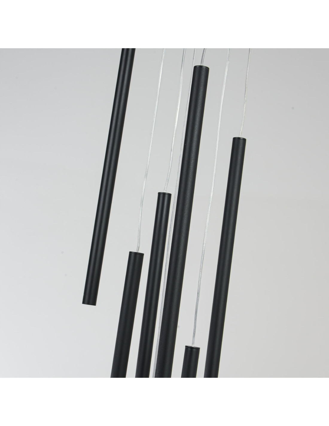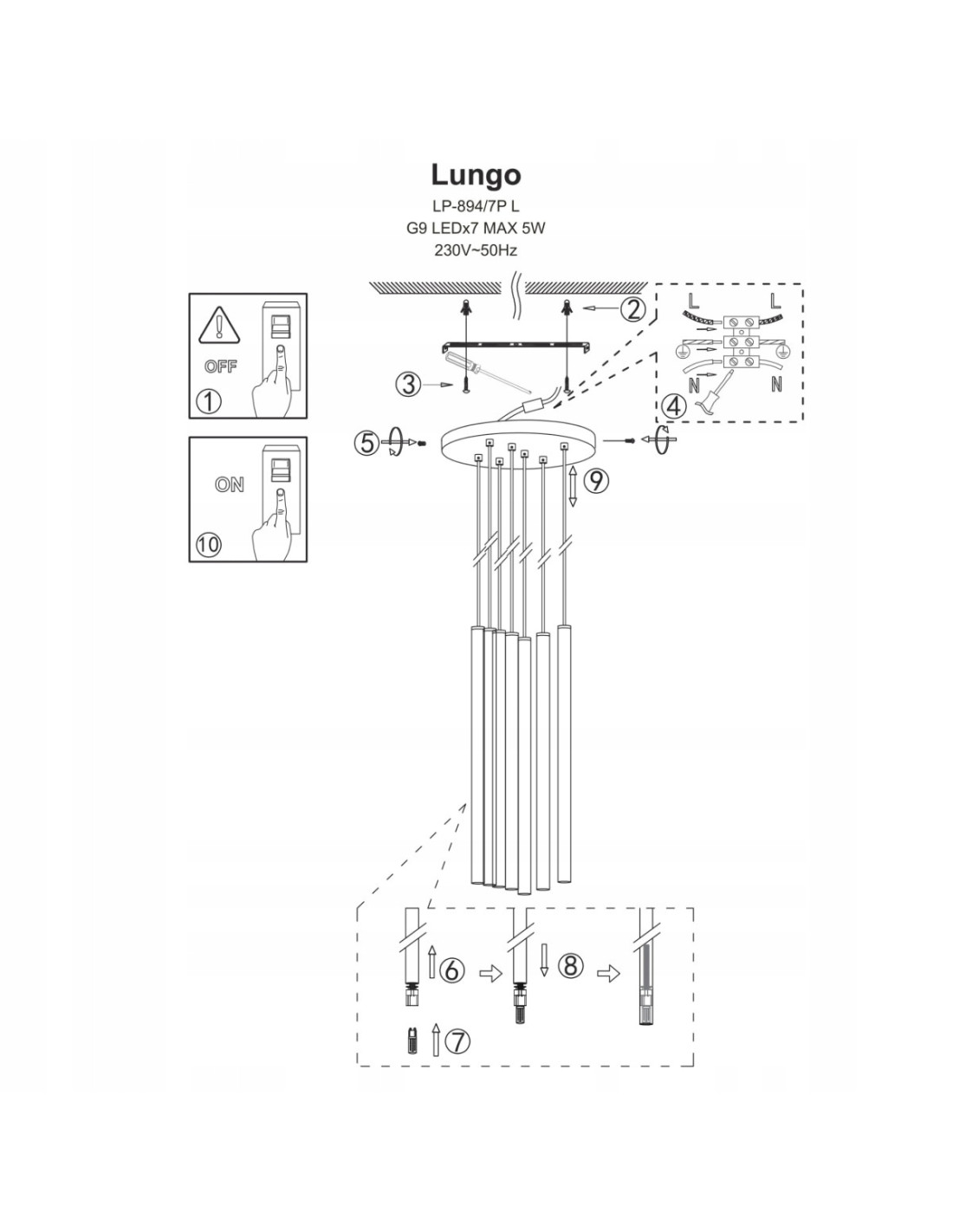 Lampa Lungo 7 charakteryzuje się wyjątkowym wyglądem dzięki nietypowym kloszom w kształcie długich, wąskich tub, które są rozmieszczone na różnych wysokościach. Pozwoli to na stworzenie niezwykłego efektu świetlnego, idealnego do podkreślenia strefy relaksu lub pracy. Każdy z siedmiu kloszy mieści żarówkę o gwincie G9, co zapewnia maksymalną moc do 5W.