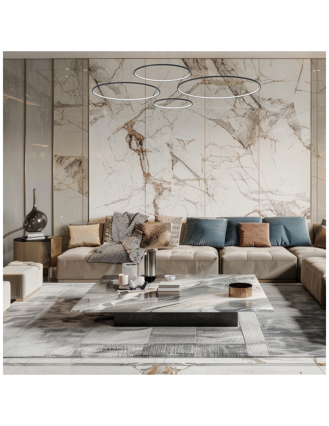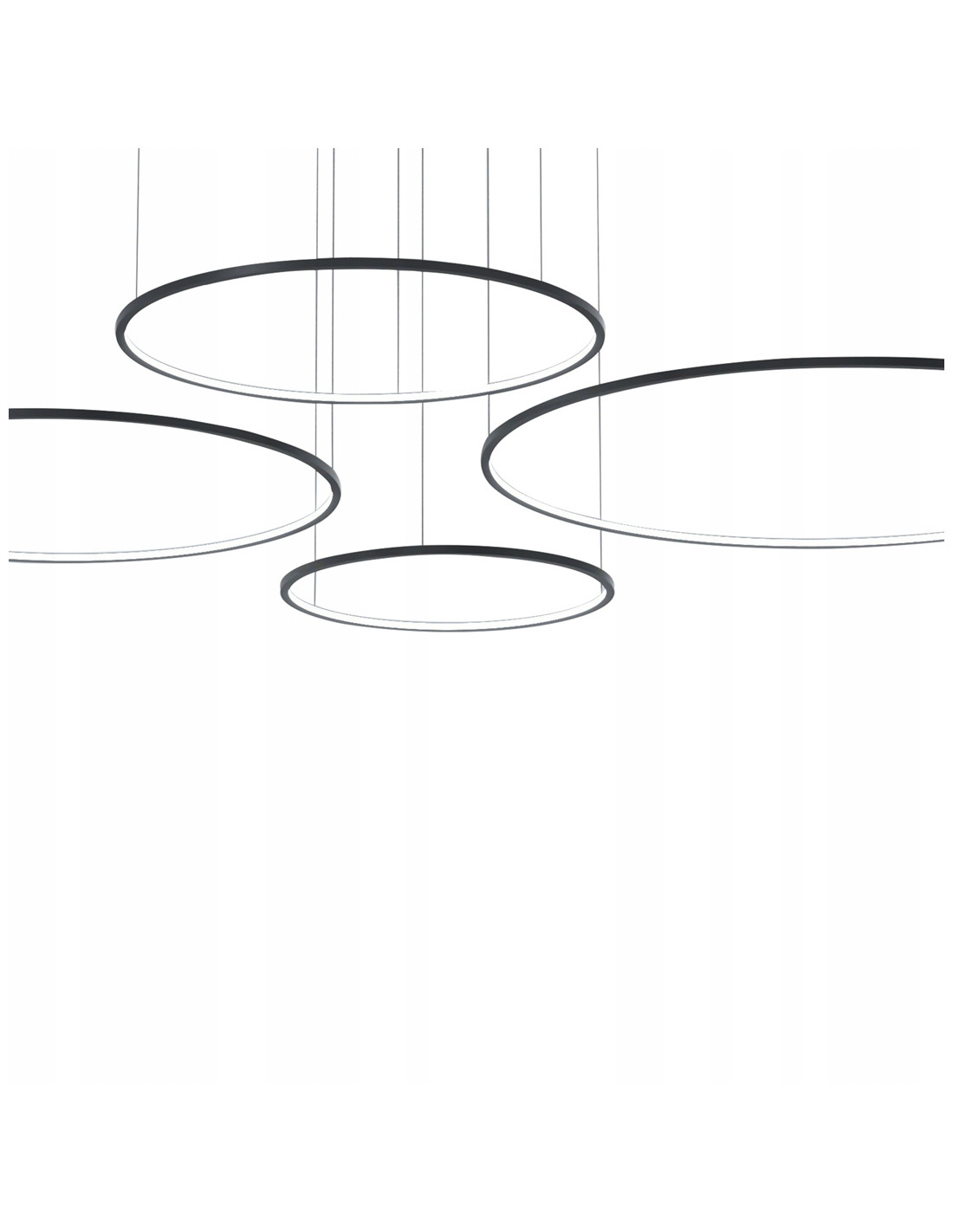 Przestrzenna lampa wisząca Saturno RINGI to propozycja dla miłośników nowoczesnego designu i funkcjonalnego oświetlenia. Wykonana z wysokiej jakości metalu i tworzywa sztucznego, prezentuje minimalistyczną formę składającą się z kilku pierścieni o średnicach 120/100/80/60 cm, które tworzą efektowną, przestrzenną kompozycję. Czarna, matowa powierzchnia oprawy doskonale komponuje się z aranżacjami w stylu loft, skandynawskim oraz nowoczesnym.