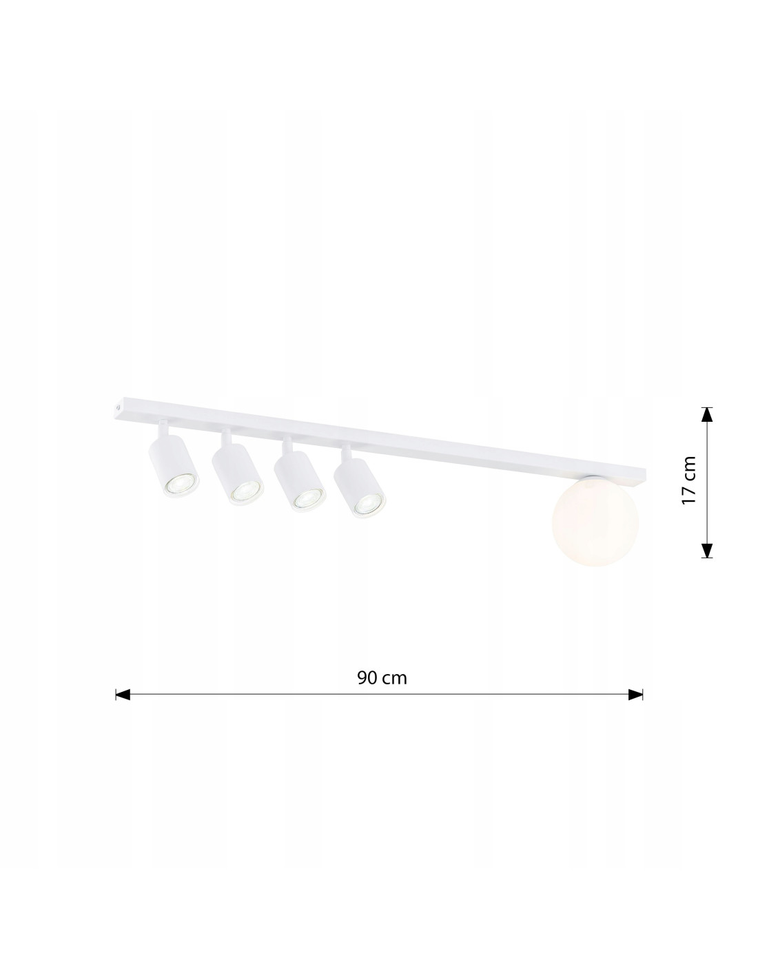 Wysoka jakość materiałów użytych do produkcji plafonu, takich jak metal i szkło, zapewnia trwałość oraz estetyczny wygląd. Elementy metalowe w chłodnym białym kolorze w połączeniu z delikatnym szklanym kloszem tworzą atrakcyjny kontrast, który przyciąga wzrok i nadaje wnętrzom nowoczesnego charakteru. Wymiary plafonu to wysokość 17 cm, szerokość 90 cm oraz średnica klosza 15 cm, co pozwala na łatwe dopasowanie do różnych przestrzeni.
