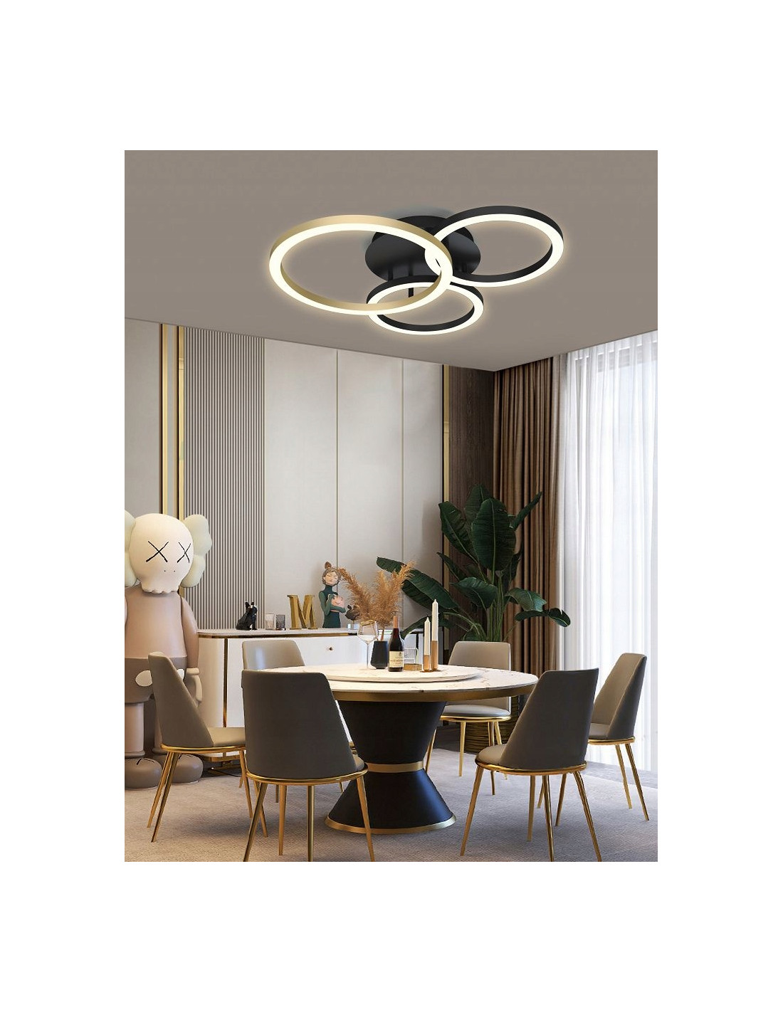 Charakterystyczne trzy pierścienie świetlne nadają całej konstrukcji dynamizmu i oryginalności. Ten geometryczny minimalizm przyciąga wzrok i stanowi nie tylko źródło światła, ale i stylowy element dekoracyjny w każdym pomieszczeniu. Plafon idealnie sprawdzi się zarówno w eleganckim salonie, jak i w przytulnej sypialni, biurze czy kuchni.