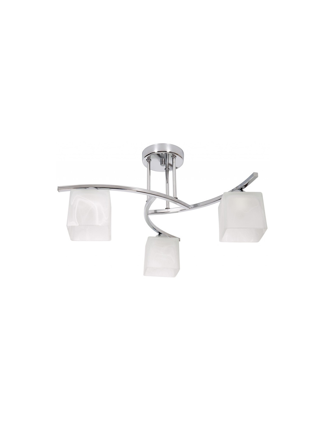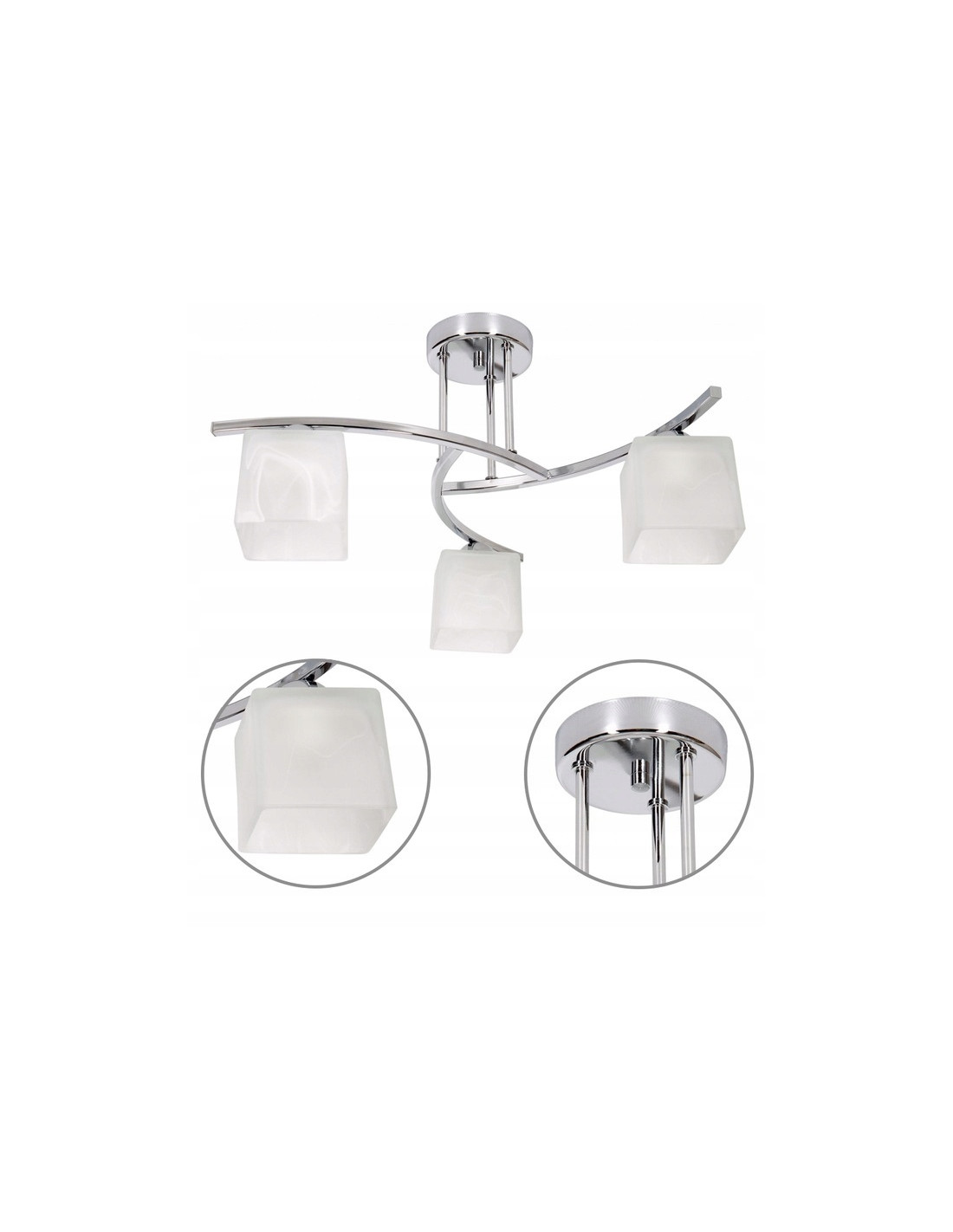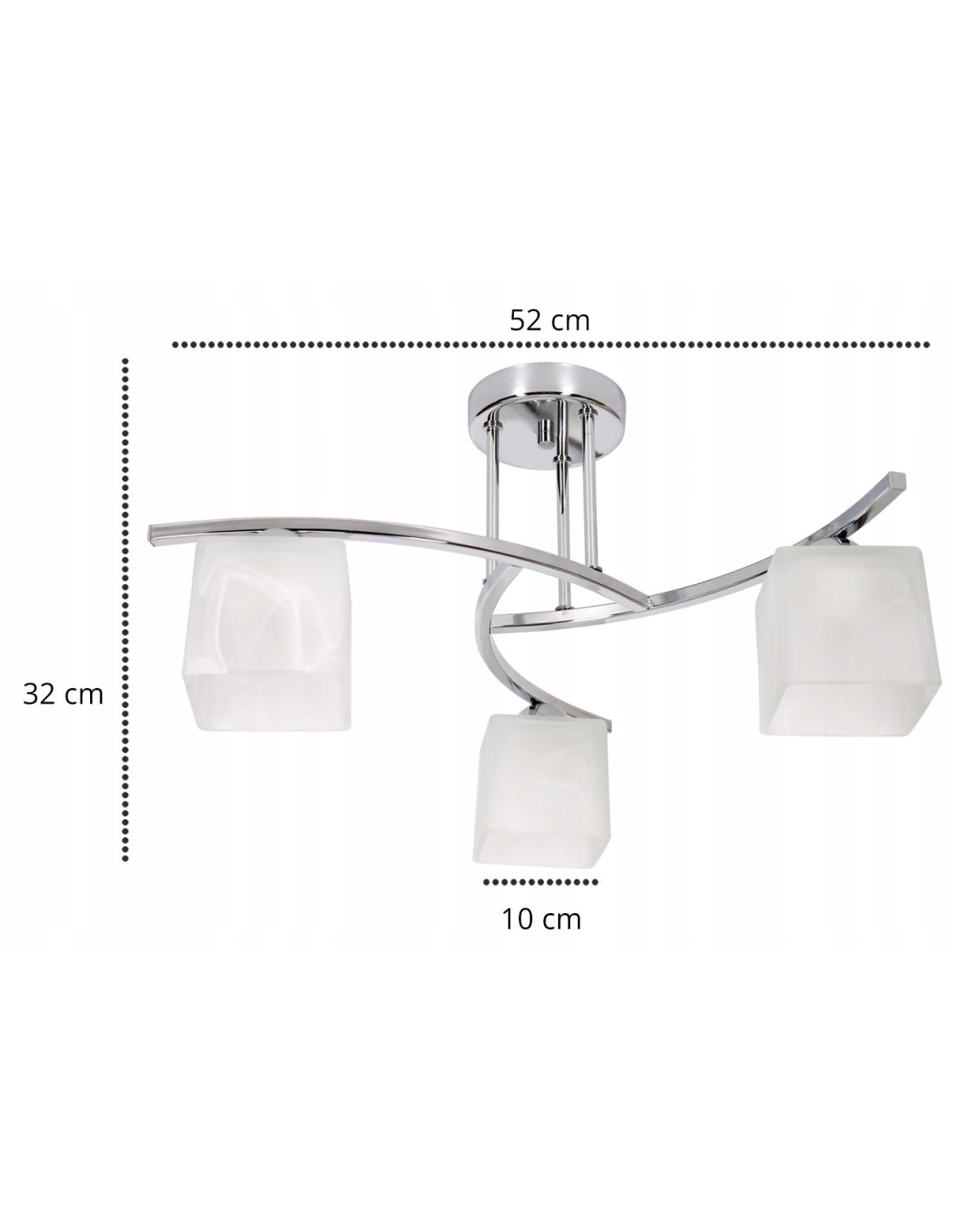 Plafon jest wyposażony w trzy białe klosze w kształcie kwadratów, które delikatnie rozpraszają światło, tworząc przyjemną atmosferę w pomieszczeniu. Subtelny blask sprawia, że każde wnętrze nabiera ciepłego i przytulnego charakteru, idealnego zarówno do salonu, jadalni, jak i korytarza czy sypialni.