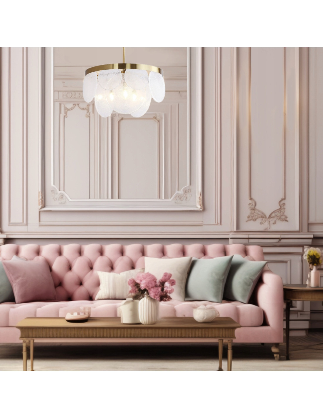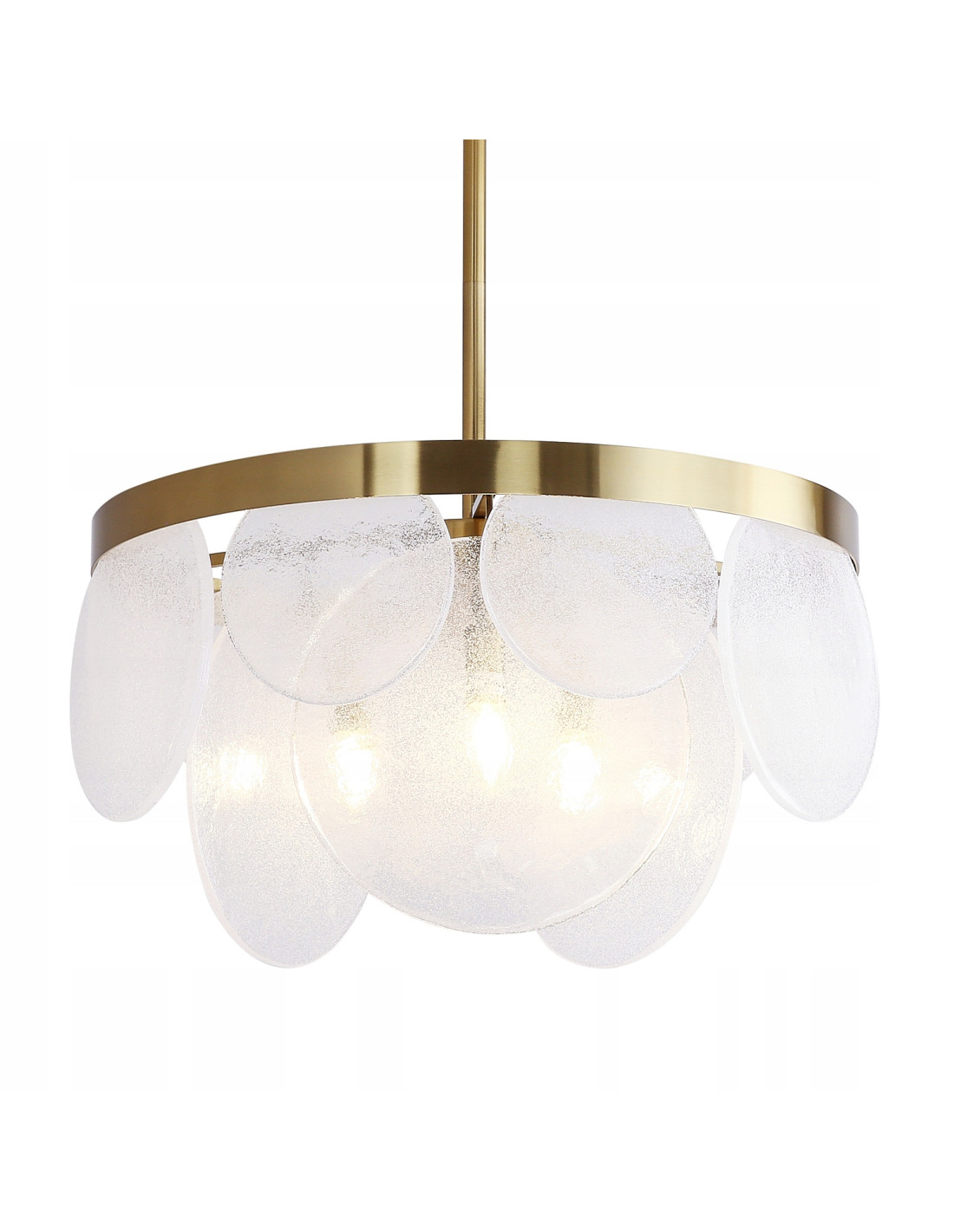 W sercu lampy AURORA znajdują się mocne, ręcznie wykonane okręgi dekoracyjne, które wyróżniają się przez zastosowanie unikalnego szkła oszronionego. Metalowy, mosiężny okrąg w połączeniu z szczotkowanym złotem tworzy harmonijną całość, co czyni tę lampę nie tylko źródłem światła, ale również eleganckim elementem wystroju. Trzy źródła światła ukryte za szklanymi elementami zapewniają przyjemne, rozproszone światło, które idealnie sprawdzi się w każdym wnętrzu.
