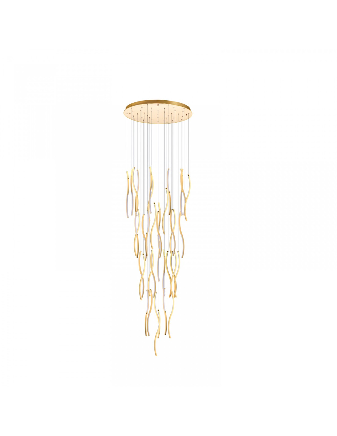 Nowoczesny żyrandol LED FLOW złoty 80 cm to elegancka i dekoracyjna lampa wisząca, zaprojektowana z myślą o wnętrzach o podwyższonym standardzie. Konstrukcja opiera się na okrągłej metalowej podsufitce w kolorze złotym, z której zwisają liczne cienkie linki zakończone smukłymi, falującymi elementami świetlnymi. Organiczna forma oraz zróżnicowana długość elementów tworzą przestrzenną i dynamiczną kompozycję, która jednocześnie zachowuje harmonię i subtelność. Lampa pełni funkcję zarówno użytkową, jak i dekoracyjną, stając się centralnym punktem aranżacji salonu, jadalni, holu lub schodów.