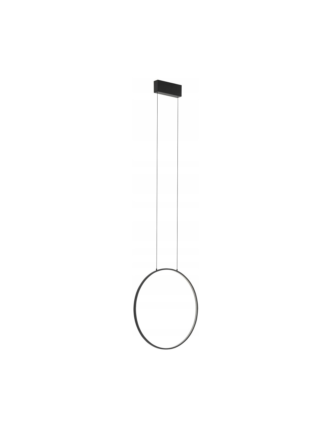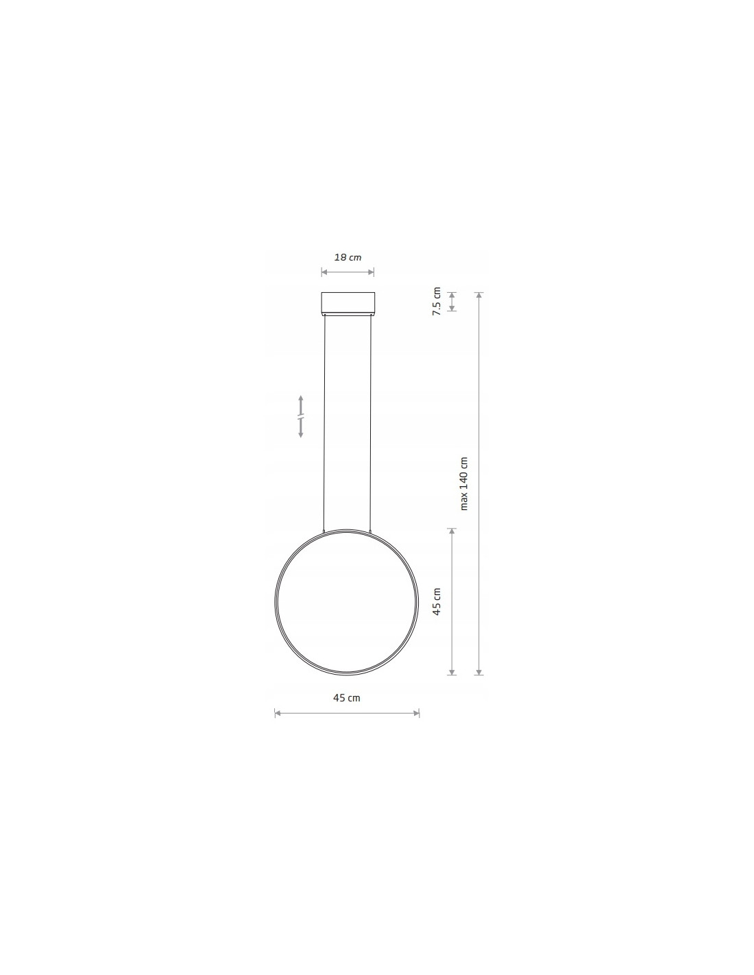 Lampa posiada regulowaną długość zawieszenia do 140 cm, co daje możliwość idealnego dopasowania wysokości nad stołem, wyspą kuchenną lub w centralnej części pokoju. Wymiary klosza o średnicy 45 cm i smukłej głębokości 4 cm sprawiają, że oprawa zachowuje lekkość formy, nie przytłaczając przestrzeni.