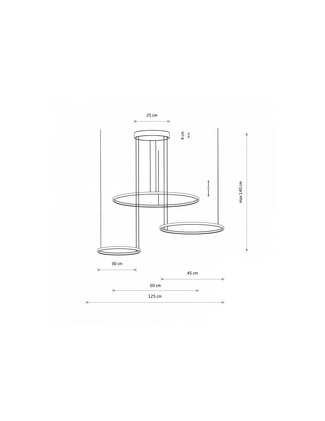 Konstrukcja i wymiary: model składa się z trzech abażurów o różnych średnicach (w tym największy Ø60 cm), całkowita szerokość wynosi 125 cm, a maksymalna wysokość instalacji to 140 cm. Podsufitka ma wymiary 25×4 cm. Materiały dominujące to lakierowane aluminium i stal oraz elementy z tworzywa sztucznego PC, co zapewnia lekkość konstrukcji i estetyczne wykończenie w kolorze czarnym z białymi akcentami.