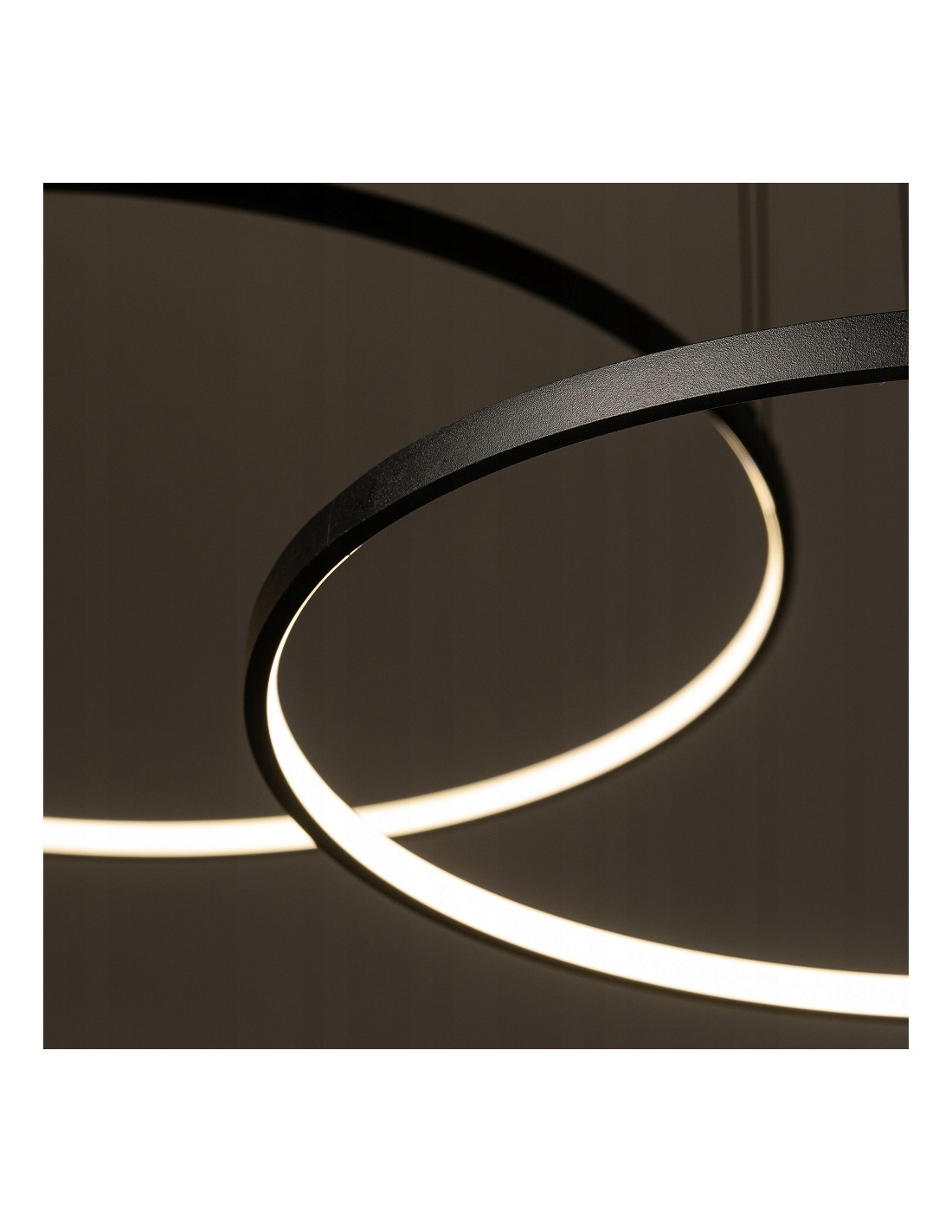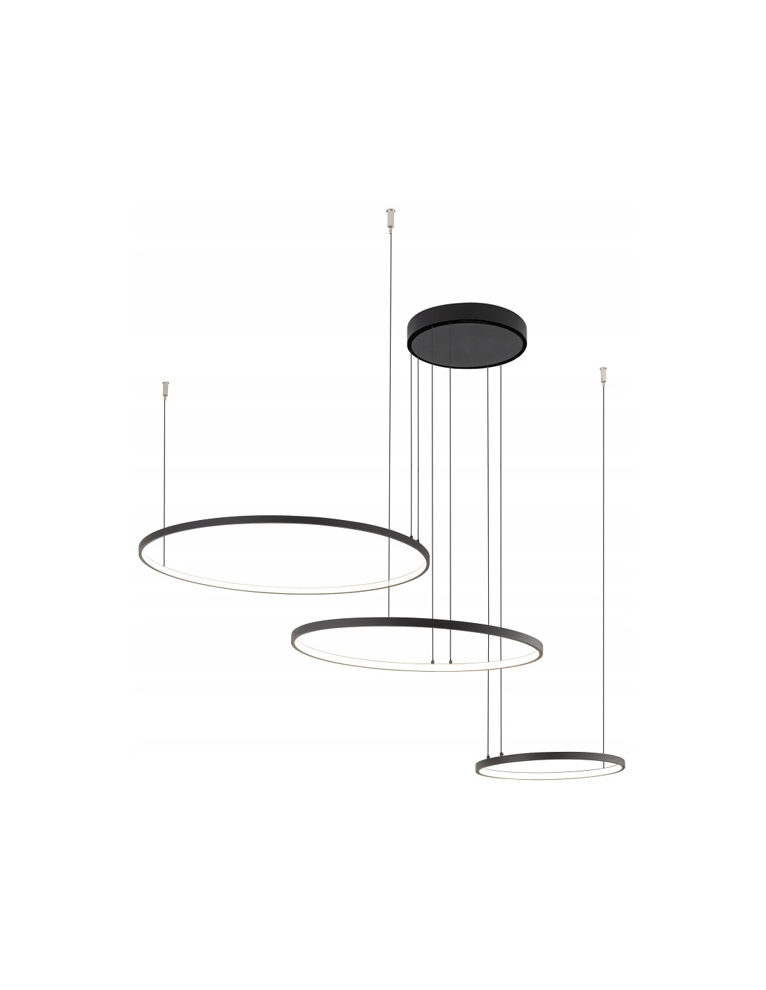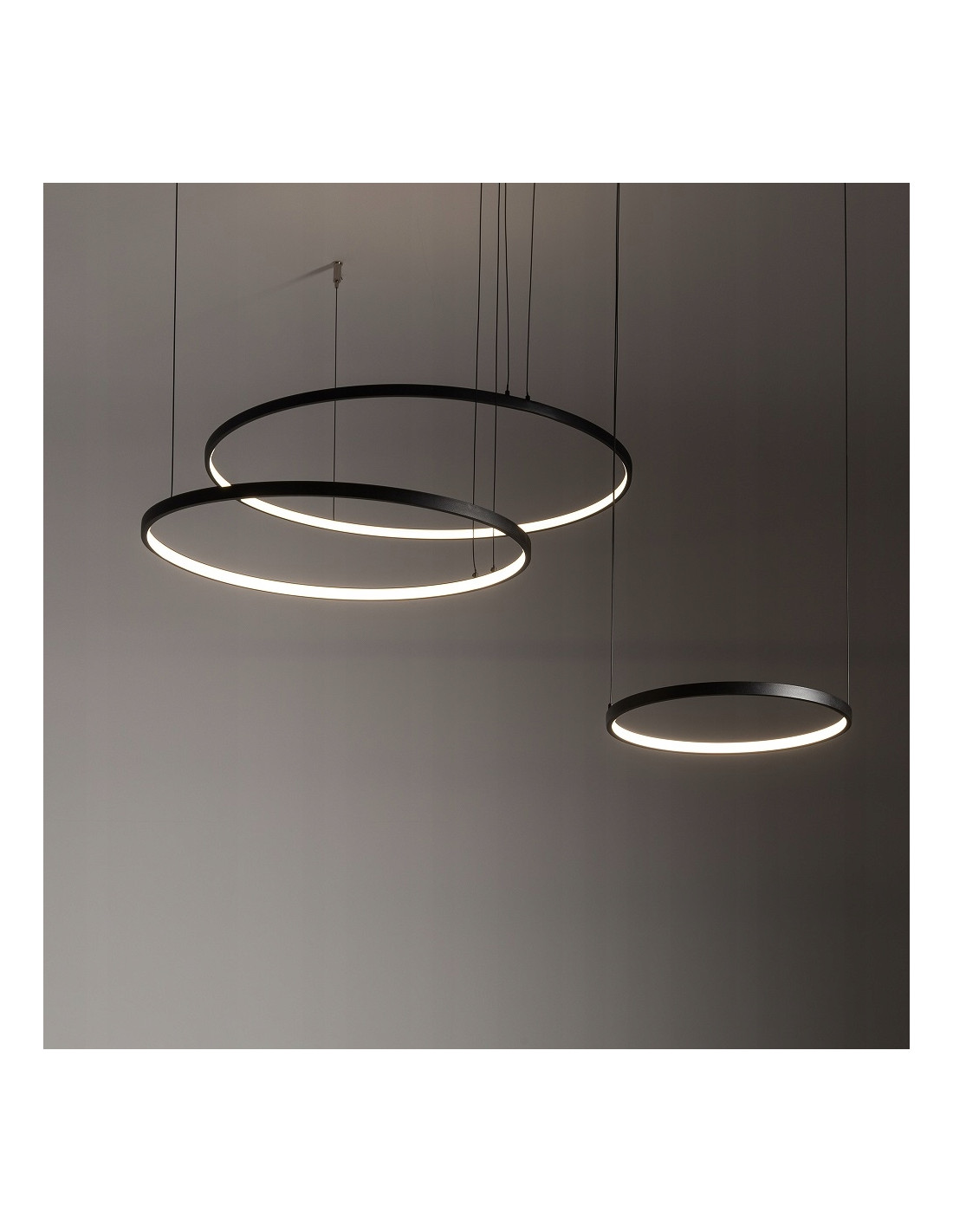 Konstrukcja lampy składa się z dwóch zawieszanych, okrągłych elementów o średnicach 30 cm, 45 cm i 60 cm (układ sekcji 1/2), które tworzą efektowny, geometryczny akcent świetlny. Maksymalna wysokość wynosi 140 cm, a szerokość całkowita to 125 cm. Montaż jest przewidziany jako bezpośredni do sufitu; modyfikacja wysokości powinna być wykonana przez elektryka z uprawnieniami SEP.