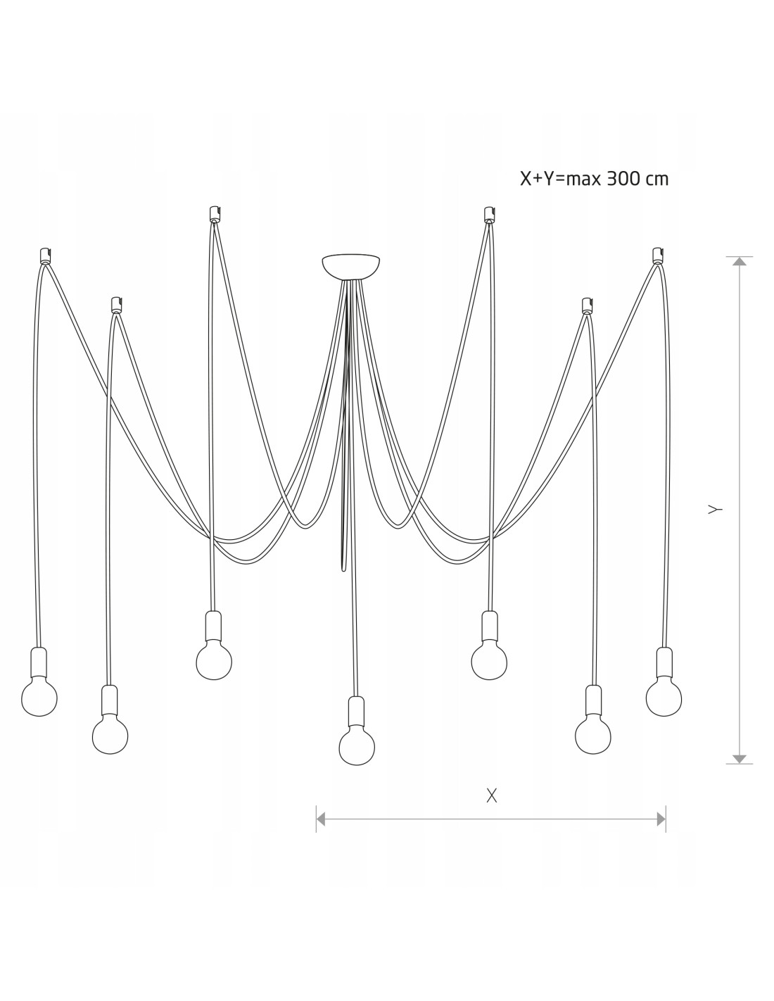 Wymiary i konstrukcja: całkowita wysokość wynosi do 300 cm (długość każdego kabla 3 m), co pozwala na elastyczne dopasowanie do wysokości pomieszczenia. Średnica i rozstaw punktów świetlnych to około 300 mm, a sam klosz ma średnicę 6 cm. Lampa jest lekka i łatwa w montażu, wykonana z trwałych materiałów, z dominującym elementem z tworzywa sztucznego.