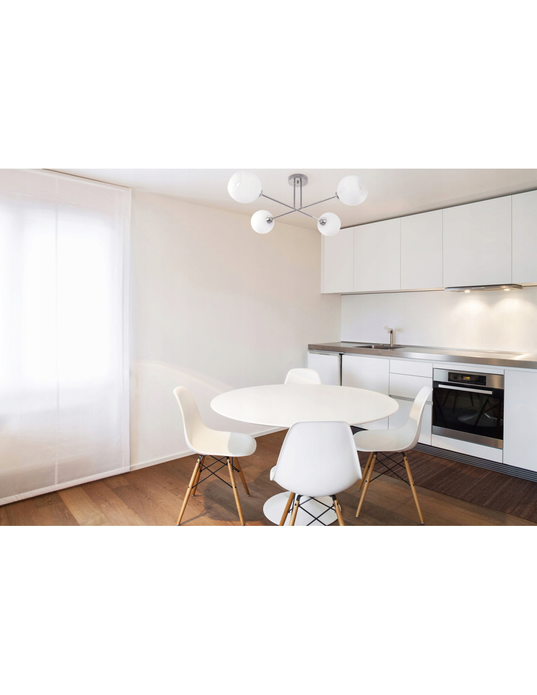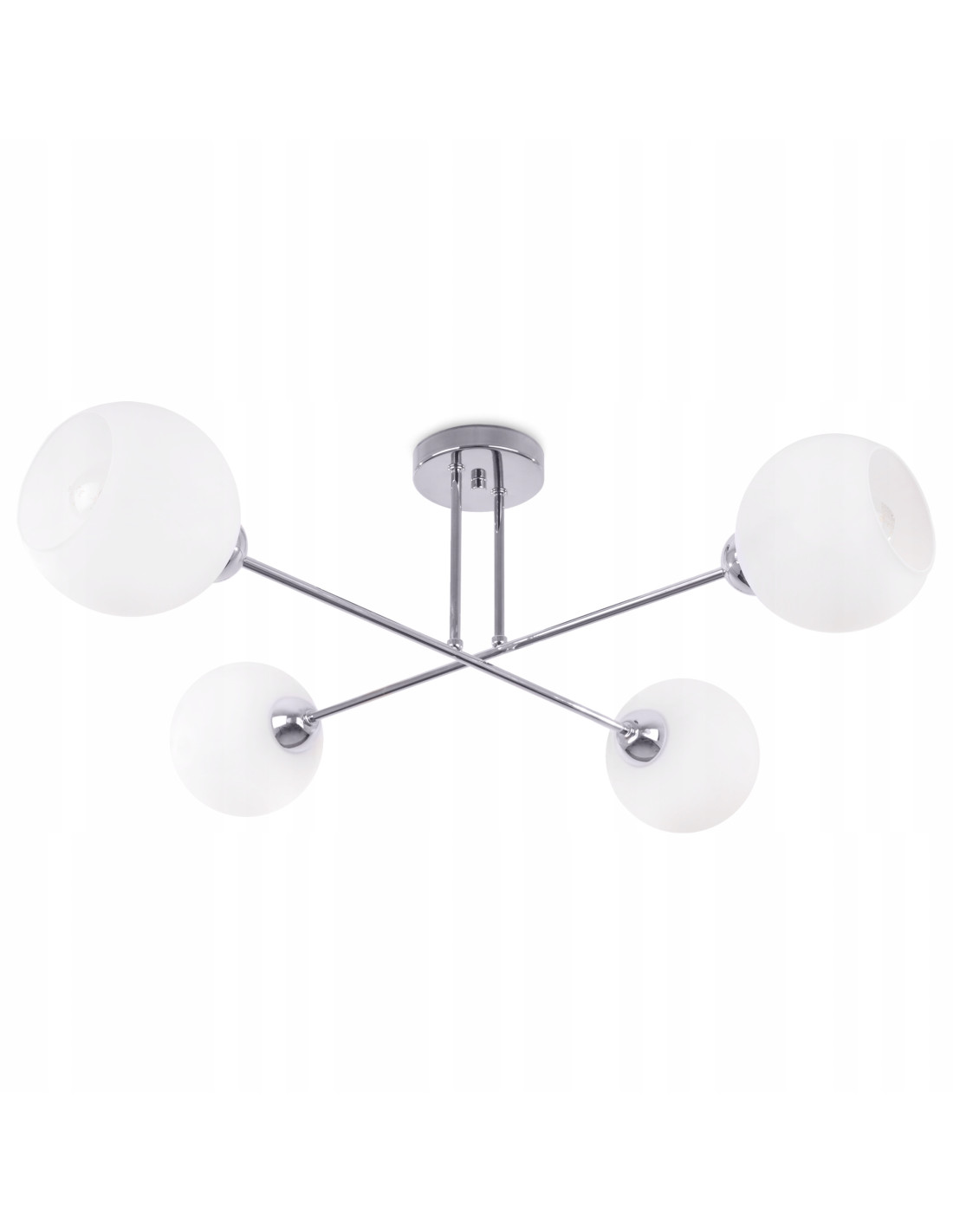 Plafon posiada cztery matowe, białe klosze, które umieszczone są na końcach metalowego ramienia w kształcie krzyża. Taka konstrukcja zapewnia równomierne oświetlenie przestrzeni, co jest niezwykle istotne w kuchni, jadalni, salonie czy sypialni. Dodatkowo, lampa tworzy przytulną atmosferę, sprzyjającą relaksowi oraz spotkaniom towarzyskim.
