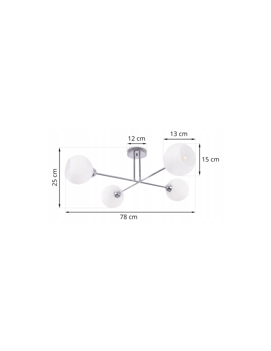 Wymiary lampy są dostosowane do różnych potrzeb użytkowników: wysokość wynosi zaledwie 25 cm, a szerokość sięga 78 cm, co sprawia, że plafon idealnie nadaje się do pomieszczeń o różnych gabarytach. Średnica klosza wynosząca 15 cm dodaje lekkości i elegancji, czyniąc lampę komponentem przyciągającym wzrok w każdym wnętrzu.