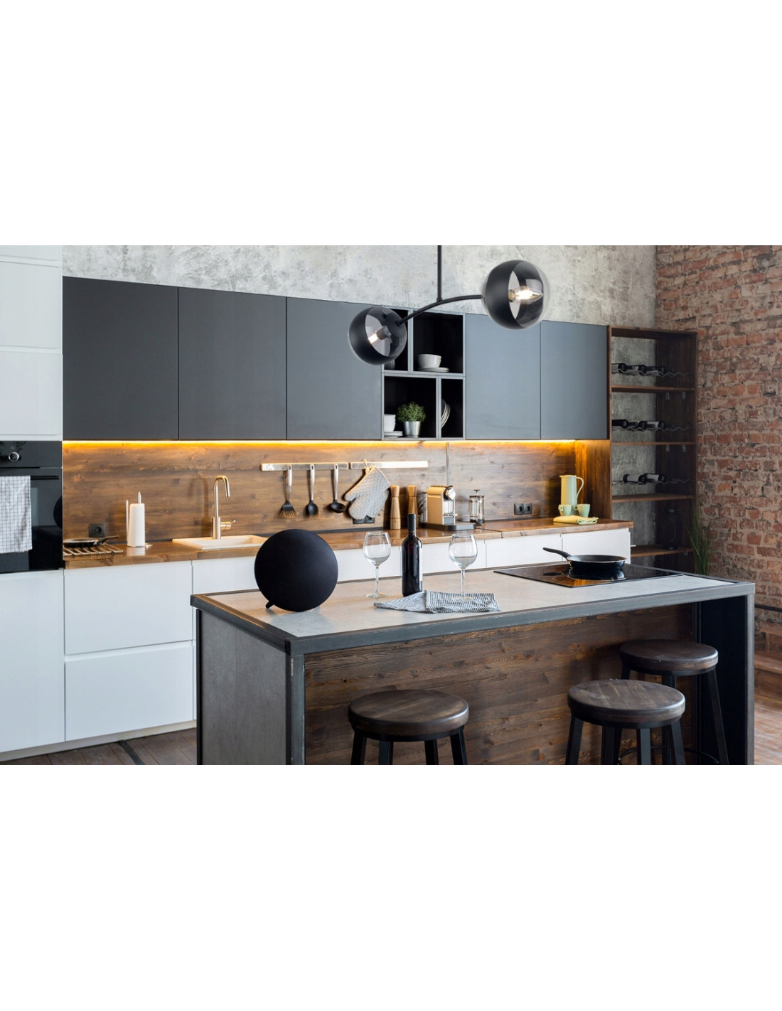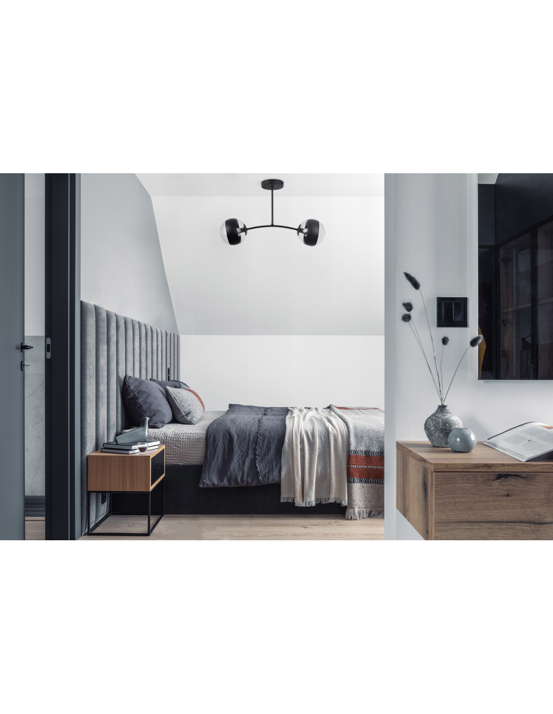 Klosze lampy wykonane z przezroczystego szkła z matowym czarnym paskiem w środku nadają całości wyjątkowy charakter. Taki detal podkreśla estetykę oraz wpływa pozytywnie na odbiór światła, które rozprasza się w pomieszczeniu, tworząc przytulną atmosferę. Plafon doskonale sprawdzi się w różnorodnych wnętrzach, od loftowych po nowoczesne przestrzenie biurowe.
