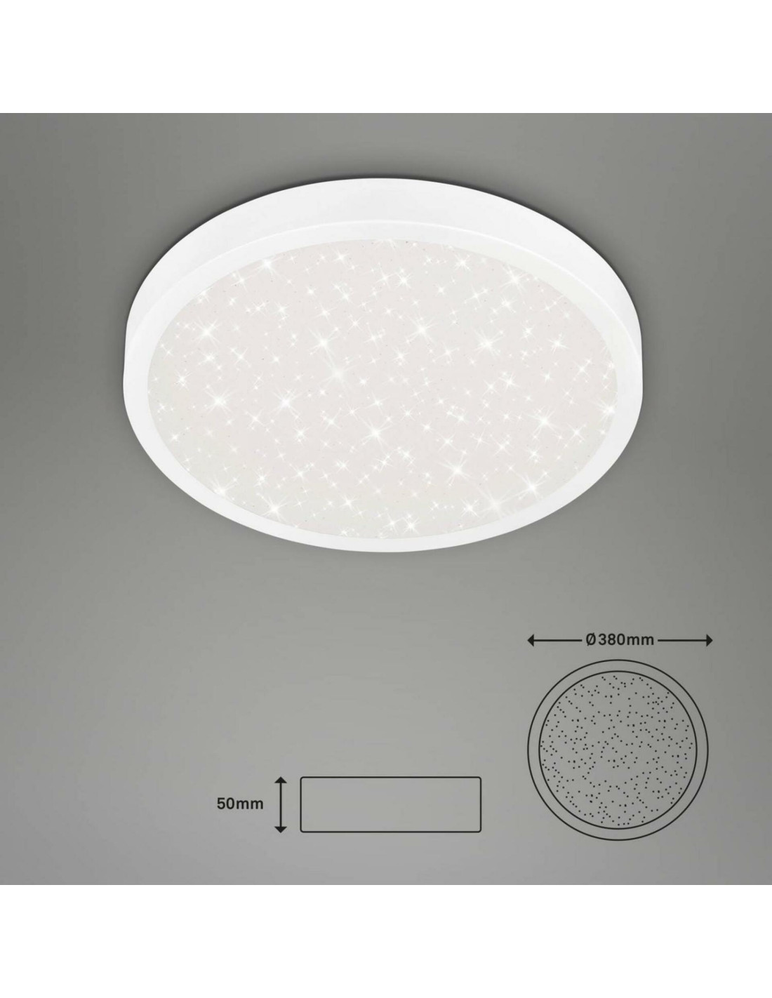 Lampa ma średnicę 38 cm i wysokość 5 cm, co czyni ją odpowiednią do użytku w pomieszczeniach o różnej wielkości. Jej solidna konstrukcja z metalu i tworzywa sztucznego gwarantuje długotrwałe użytkowanie. Co więcej, żywotność modułu LED wynosi aż 25 000 godzin, co przekłada się na około 17 lat użytkowania przy założeniu przeciętnego czasu pracy wynoszącego 4 godziny dziennie.
