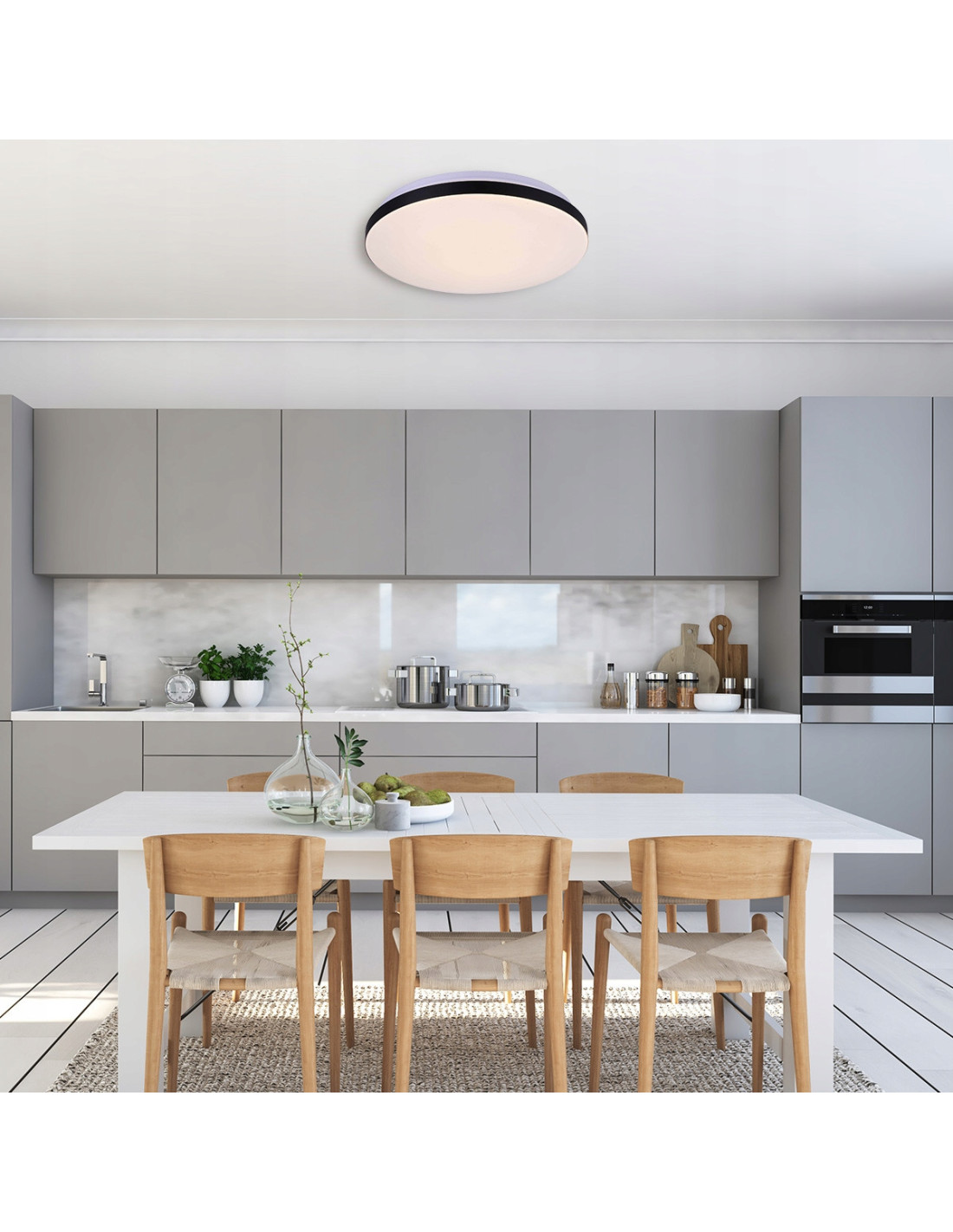 Plafon został zaprojektowany z myślą o funkcjonalności, oferując okrągły kształt i smukłą konstrukcję, które umożliwiają estetyczne zamontowanie go blisko sufitu. Dzięki swoim wymiarom (średnica 38 cm, wysokość 6,5 cm), lampa doskonale sprawdzi się jako główne źródło światła w dużych pomieszczeniach, np. w salonie czy jadalni, jak również jako oświetlenie dodatkowe w mniejszych przestrzeniach.