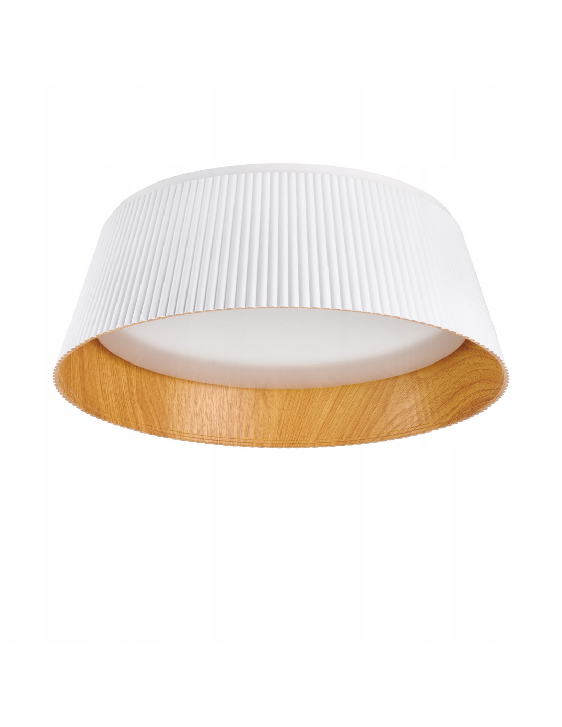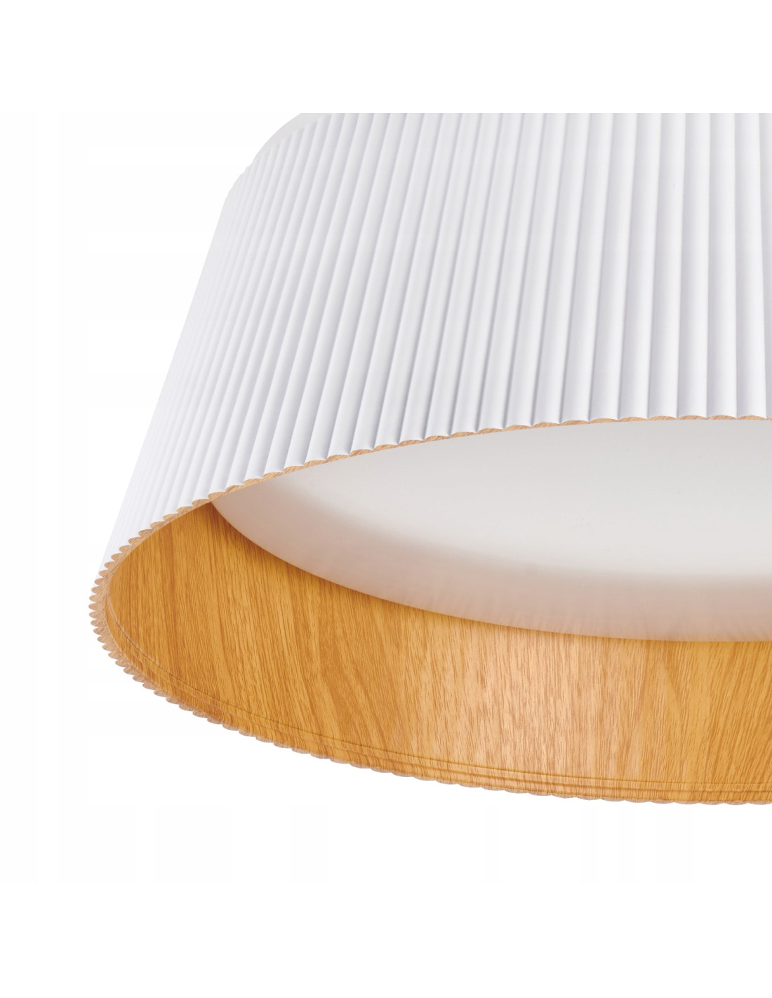 Plafon wykonany jest z wysokiej jakości materiałów, w tym metalu i drewna, co zapewnia jego trwałość i długowieczność. Jego zewnętrzna część ma formę szerokiego, lekko stożkowatego pierścienia, pokrytego czarnym materiałem o charakterystycznym ryflowaniu, które nadaje mu oryginalnego stylu. Wnętrze plafonu, które jest widoczne od dołu, imituje naturalne drewno w ciepłym, jasnym odcieniu, co tworzy wyjątkowy efekt kontrastu.