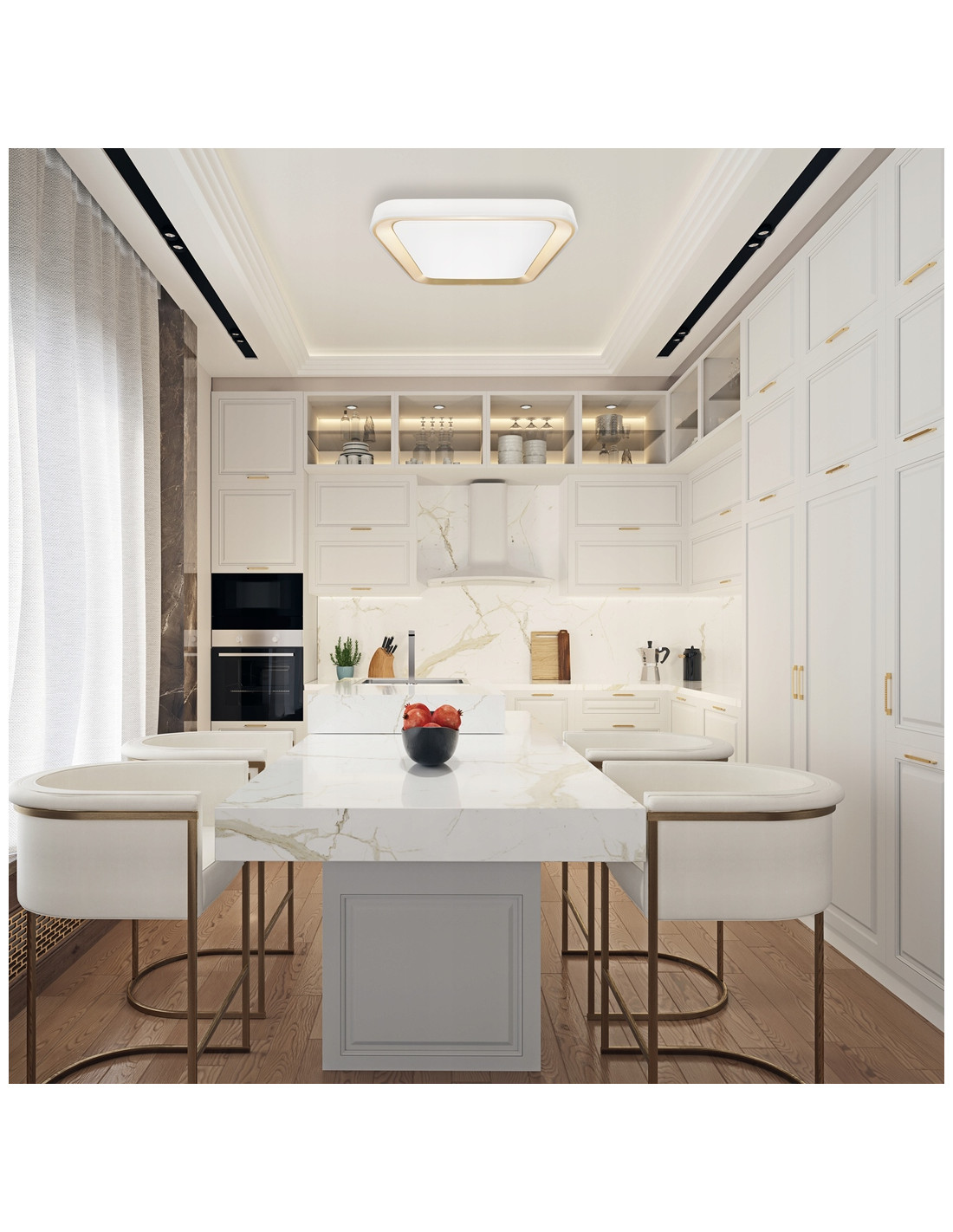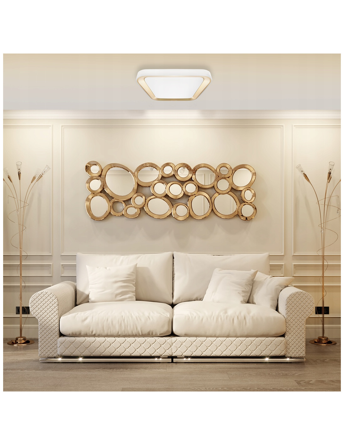 Nowoczesny plafon LED QUADRO GOLD to idealna propozycja dla osób, które poszukują efektywnego i estetycznego rozwiązania oświetleniowego do swojego domu lub biura. Jego minimalistyczny design w połączeniu z biało-złotą kolorystyką sprawia, że stanowi on elegancki dodatek do każdego wnętrza.