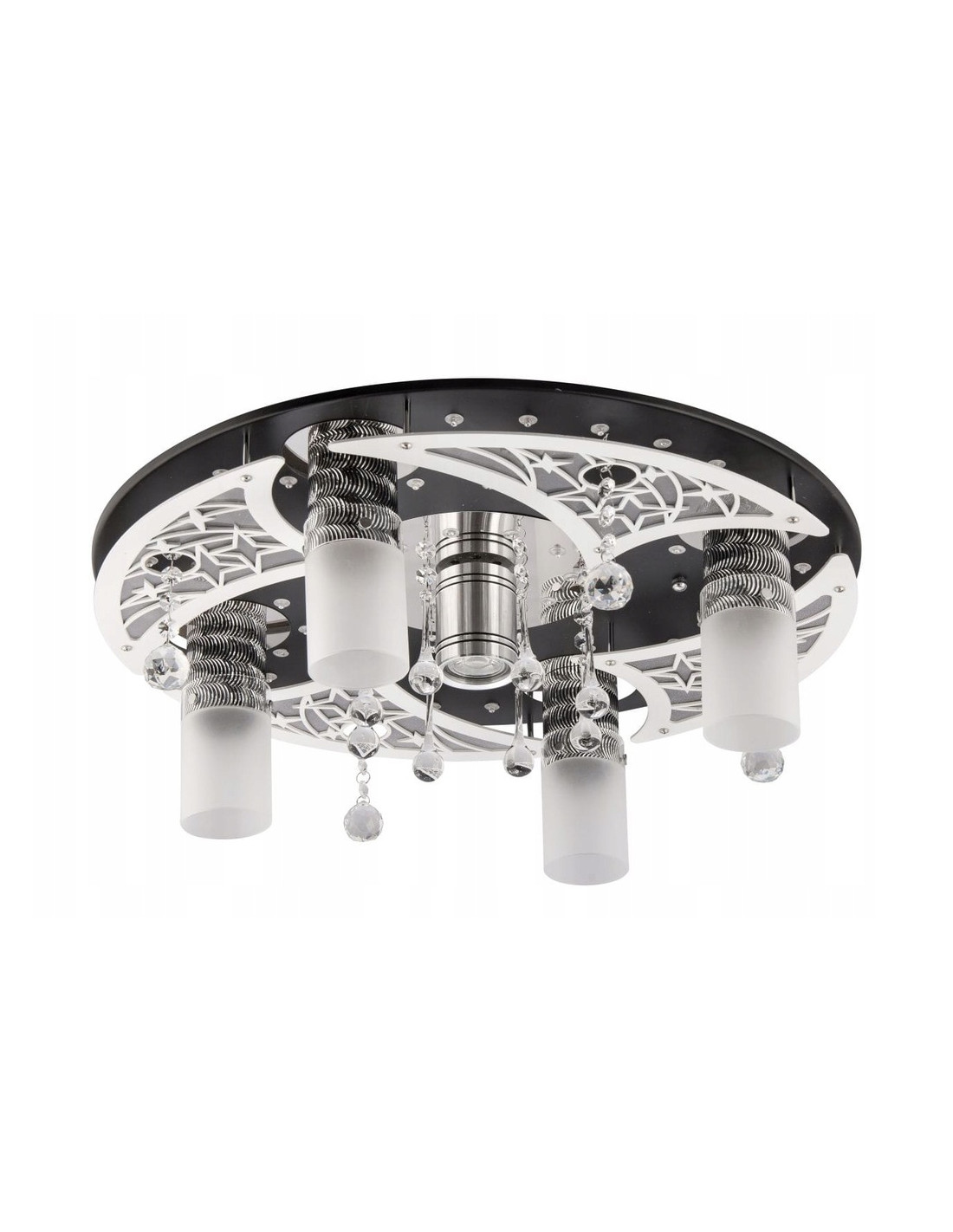 Każdy z elementów plafonu został starannie zaprojektowany, aby zapewnić nie tylko efektowny wygląd, ale również wysoką jakość światła. Szeroka średnica 55 cm i wysokość 23 cm sprawiają, że lampa doskonale oświetli nawet większe pomieszczenia. Eleganckie klosze w odcieniach czerni i bieli harmonizują z kryształkami, które delikatnie rozpraszają światło, tworząc nastrojowe iluminacje.