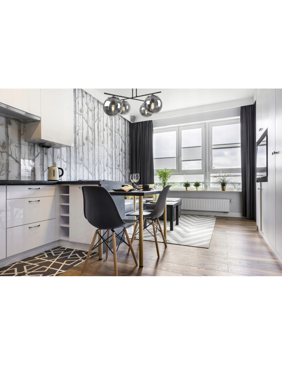 Klosze z dymionego szkła emitują światło w sposób delikatny i rozproszony, co tworzy przyjemną atmosferę w pomieszczeniu. Dzięki regularnemu rozmieszczeniu punktów świetlnych, plafon zyskuje na równowadze, a jego minimalistyczny styl podkreśla elegancję nowoczesnych aranżacji. To rozwiązanie, które doskonale pasuje do salonu, sypialni, jadalni oraz innych przestrzeni.