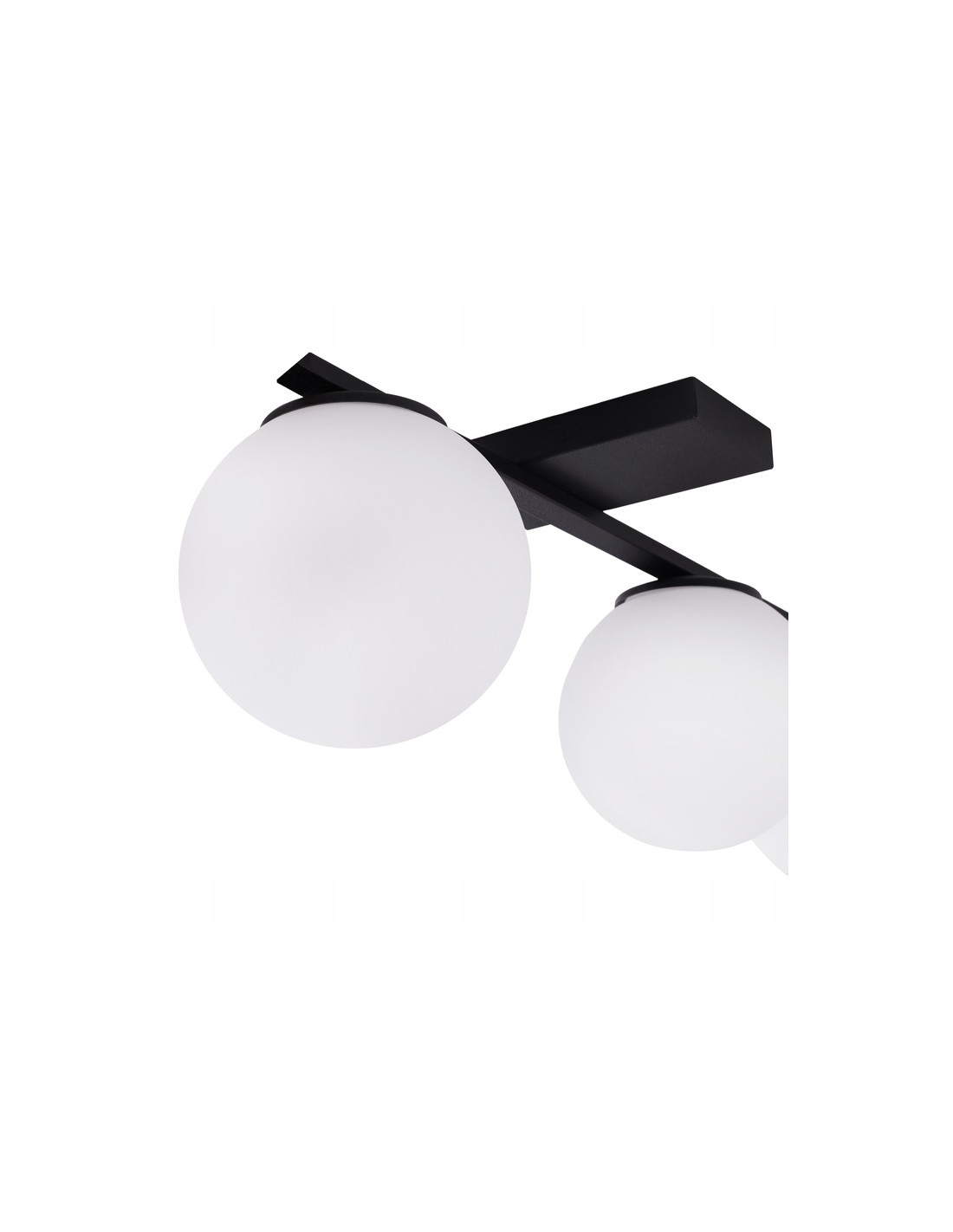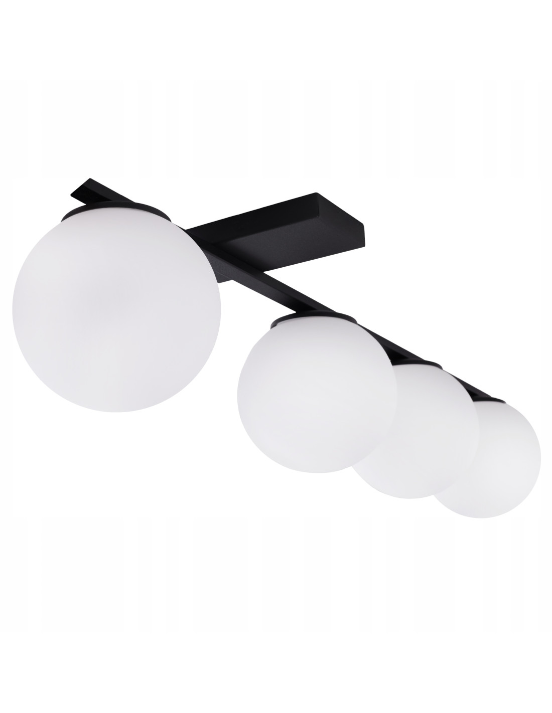 Konstrukcja plafonu składa się z czterech białych kul wykonanych z matowego szkła, które zapewniają równomierne rozproszenie światła. Dzięki temu, staje się on idealnym wyborem do takich pomieszczeń jak: salon, sypialnia czy korytarz. Wysoka jakość materiałów oraz precyzyjne wykonanie sprawiają, że produkt jest nie tylko funkcjonalny, ale również trwały.