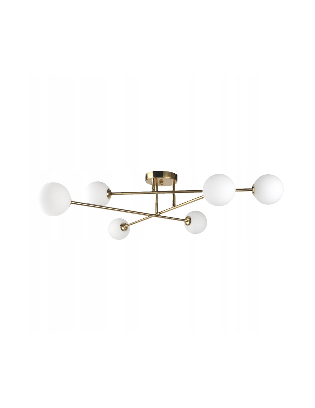 Lampa sufitowa DORADO 6 to wyjątkowe połączenie elegancji z nowoczesnym stylem, idealne dla osób poszukujących oryginalnego oświetlenia do swoich wnętrz. Jej asynchroniczne rozmieszczenie źródeł światła oraz przepiękne białe klosze w kształcie kul dodają charakteru oraz unikatowego wyglądu, który z pewnością przyciągnie wzrok każdego gościa. Wykonana z najwyższej jakości materiałów, lampa łączy w sobie funkcjonalność i estetykę, a jej złoty kolor nadaje luksusowej atmosfery w każdym pomieszczeniu.