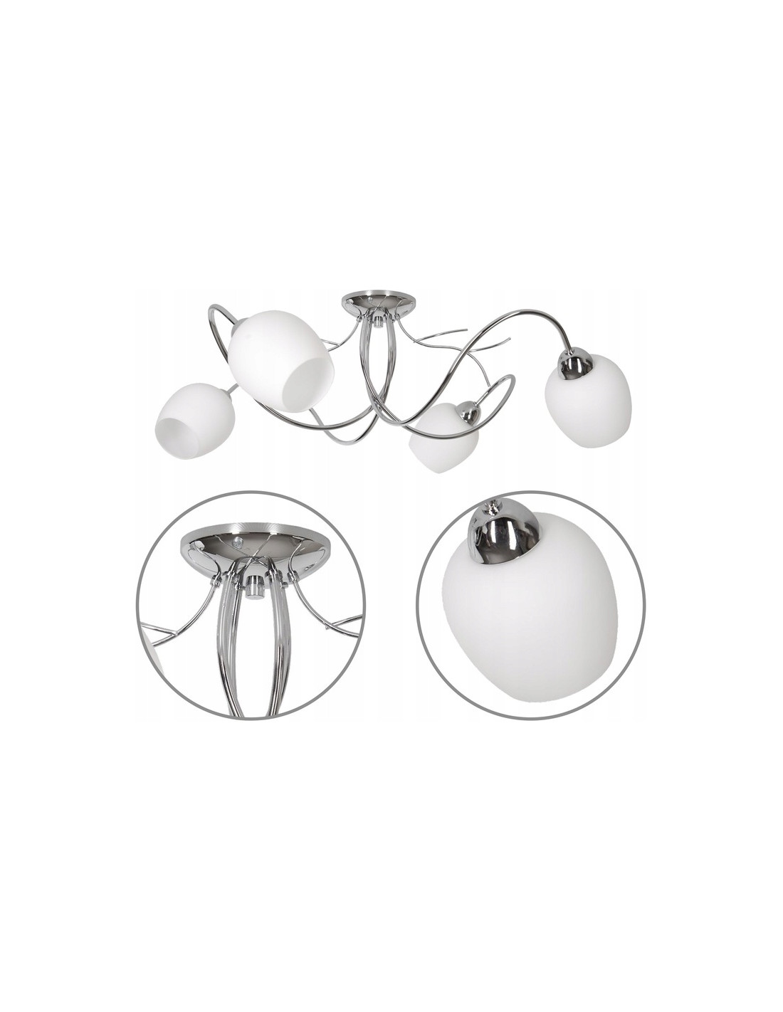 Konstrukcja lampy wykonana jest z metalu, co zapewnia wysoką trwałość, a szklane klosze dodają jej lekkości i elegancji. Dzięki falistym łączeniom, produkt zyskuje na oryginalności, a jego minimalistyczna kolorystyka – biała i srebrna – sprawia, że staje się uniwersalnym rozwiązaniem do wielu przestrzeni. Dodatkowo, plafon charakteryzuje się wysokością 34 cm oraz szerokością 60 cm, co czyni go odpowiednim do zarówno mniejszych, jak i większych pomieszczeń.