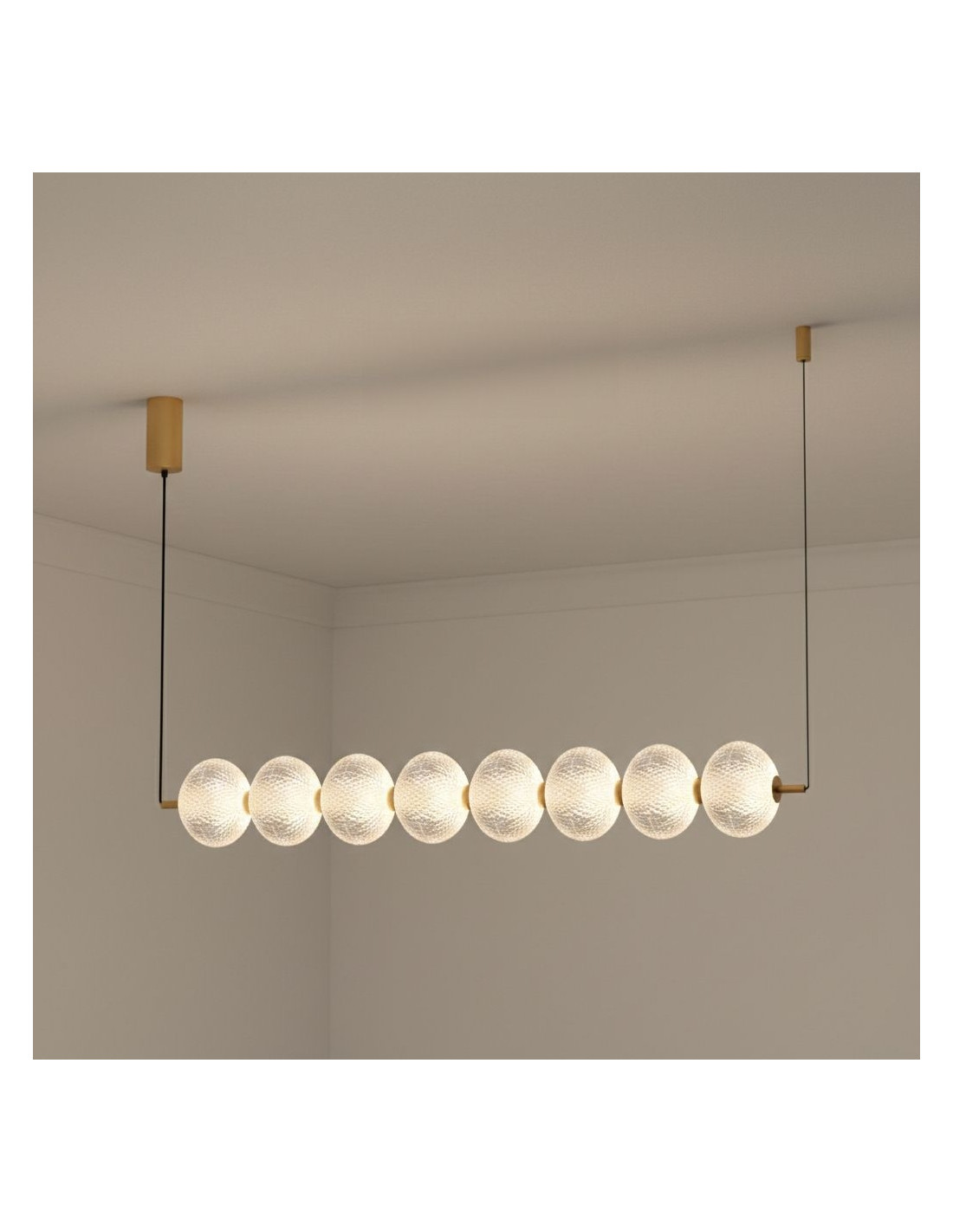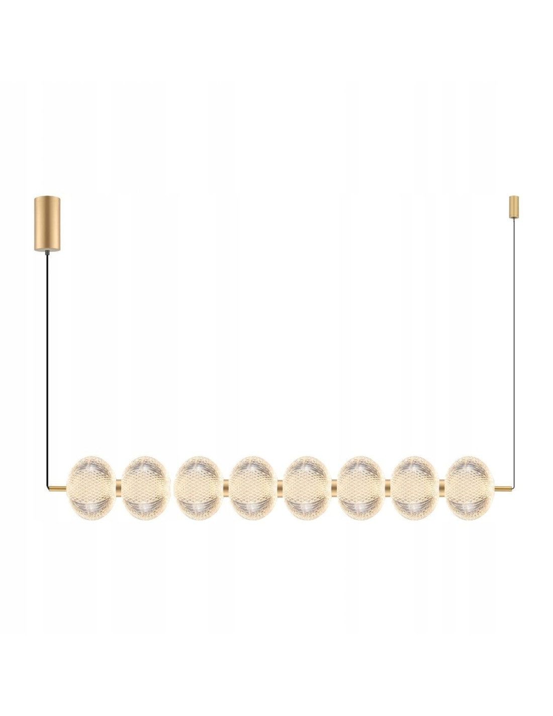 Zuma Line GALATEA to ekskluzywna lampa wisząca LED 50W, łącząca wyrafinowany, minimalistyczny design z funkcjonalnymi rozwiązaniami dla nowoczesnych wnętrz. Smukła, podłużna konstrukcja z złotą belką i transparentnym wykończeniem doskonale komponuje się nad wyspą kuchenną, stołem w jadalni lub w przestronnym salonie, podkreślając elegancję aranżacji. Lampa została wykonana z trwałego metalu i zaprojektowana tak, aby stanowić zarówno efektowny element dekoracyjny, jak i wydajne źródło światła.