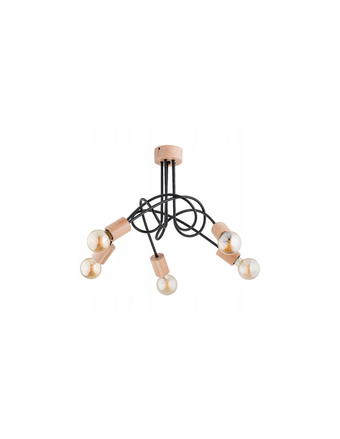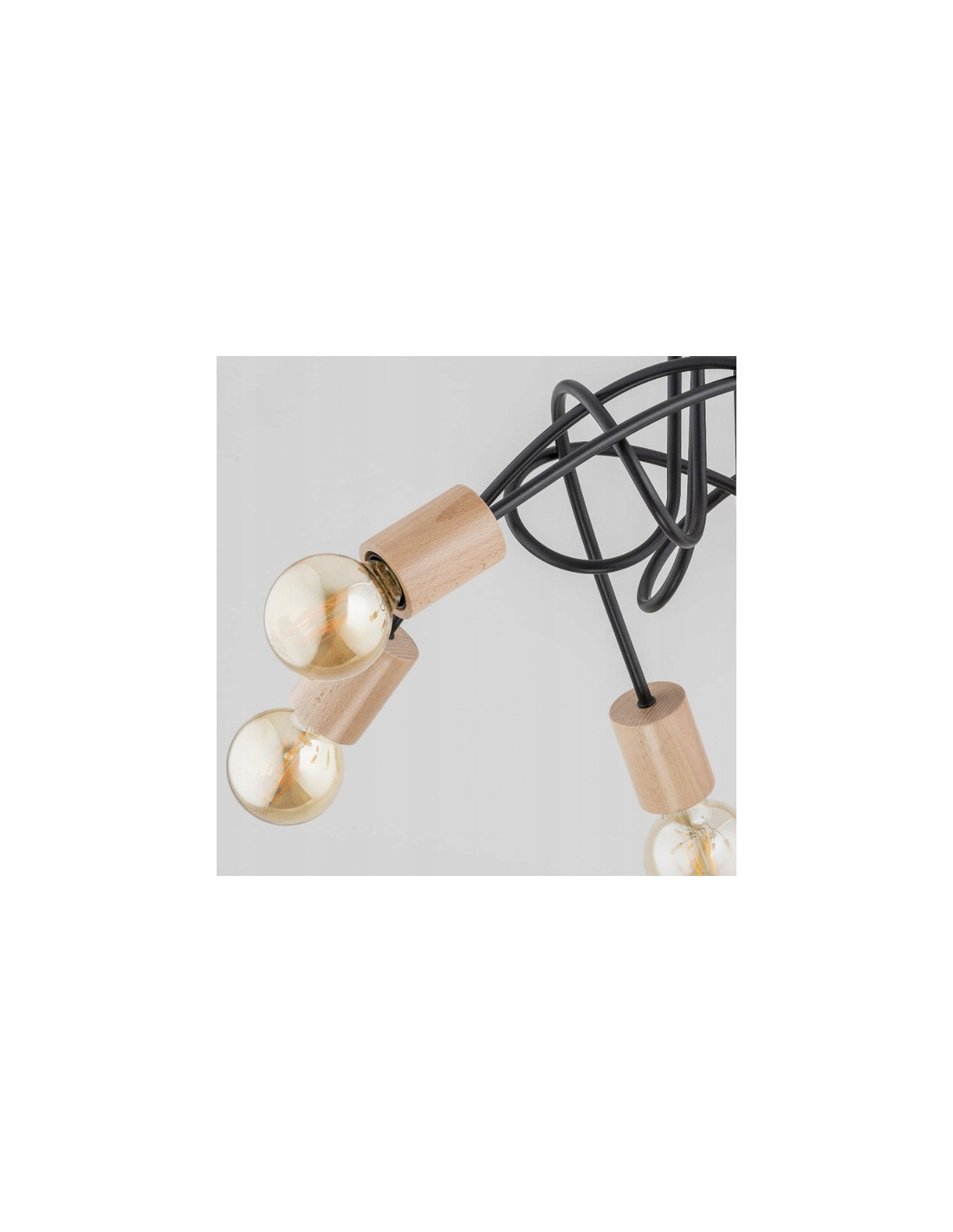 Stelaż lampy został wykonany z metalu w kolorze czarnym, co zapewnia trwałość oraz nowoczesny wygląd. Elementy drewniane w beżowym kolorze doskonale współgrają z całością, wprowadzając do pomieszczenia przytulność i ciepło. Dzięki otwartej konstrukcji żarówki nie są osłonięte, co skutkuje intensywnym, równomiernym światłem, a ich odpowiedni dobór pozwala na stworzenie przyjemnej atmosfery w każdym wnętrzu.