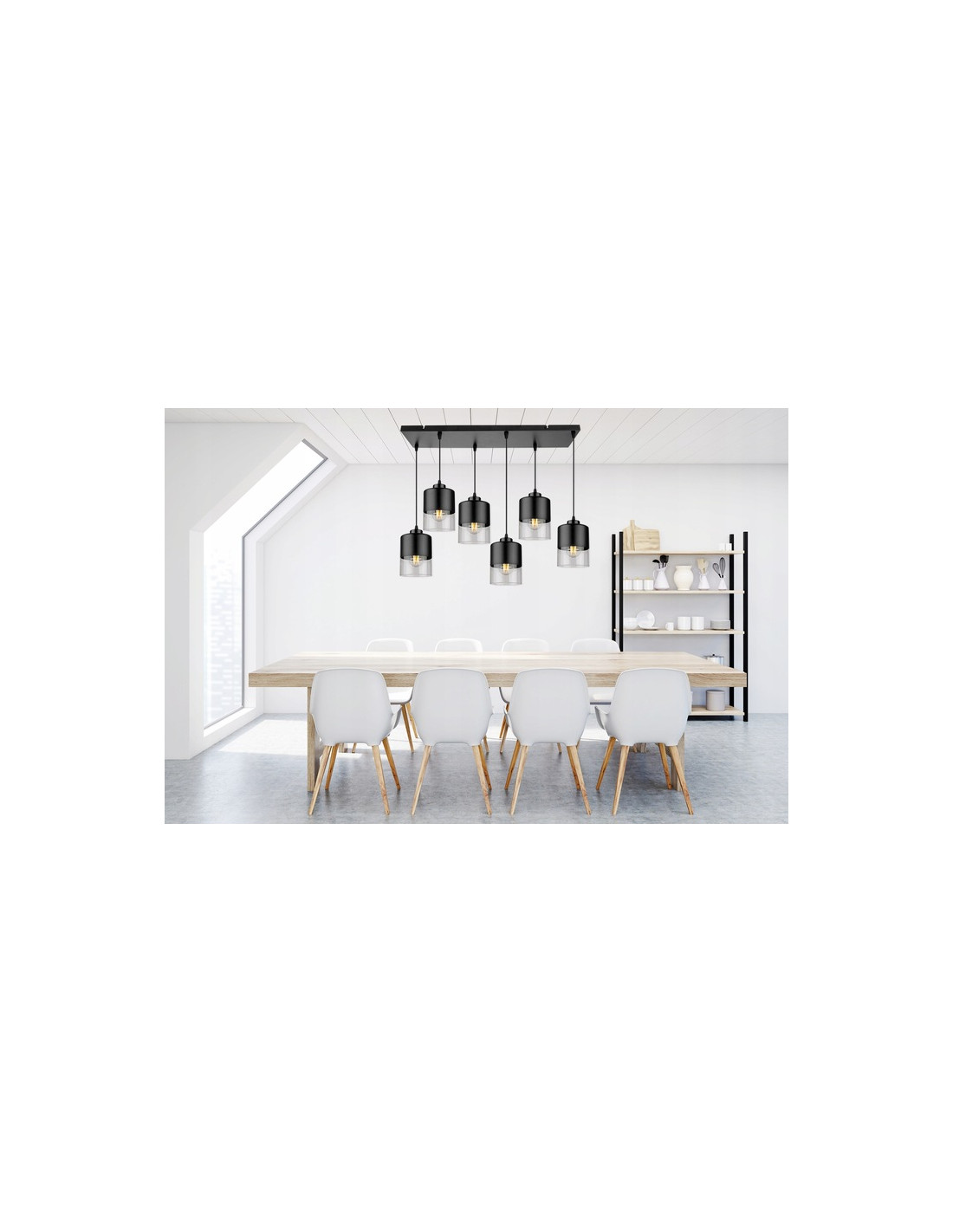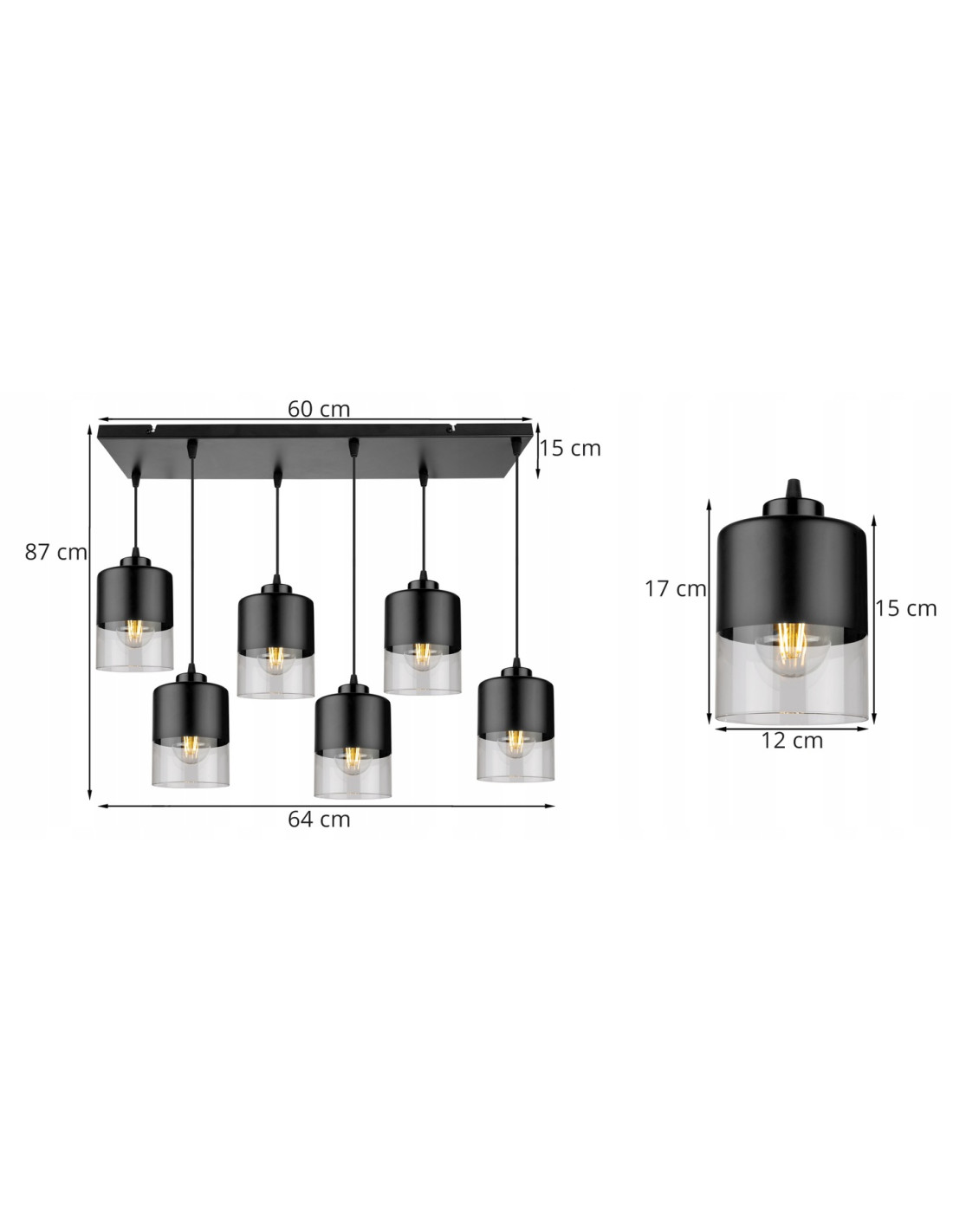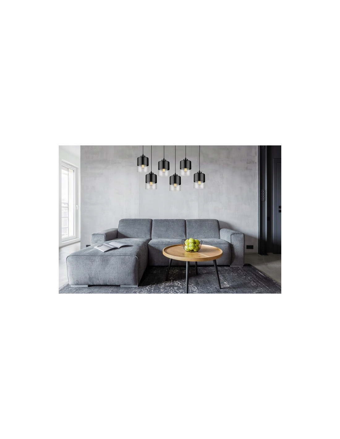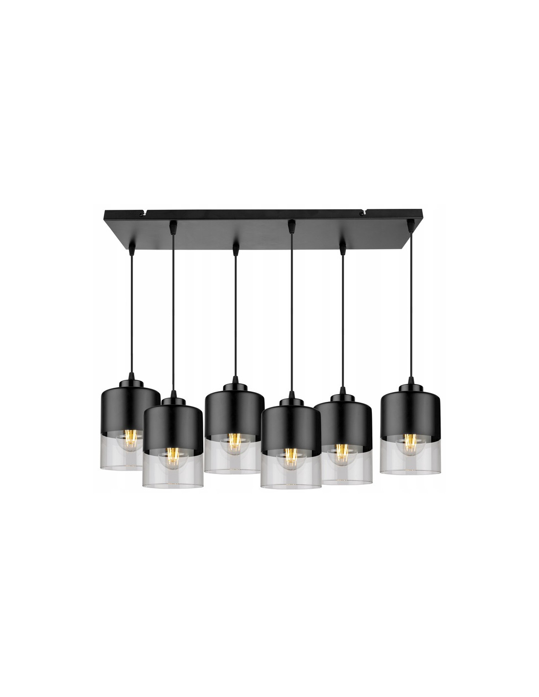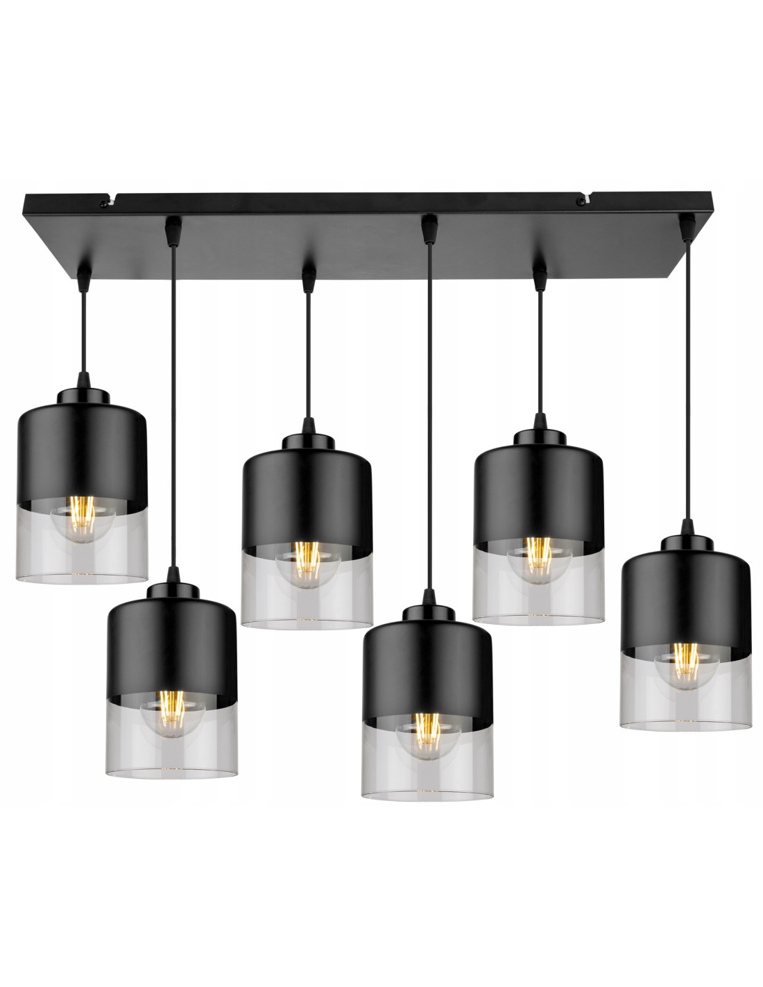 Wyposażona w sześć kloszy wykonanych z połączenia przezroczystego szkła i czarnego metalu, lampa zapewnia wysoki poziom naświetlenia, co czyni ją idealnym rozwiązaniem do kuchni, salonu czy jadalni. Prosty, a jednocześnie efektowny design żyrandola to jego niewątpliwy atut, który świetnie komponuje się w różnorodnych stylach wnętrzarskich.