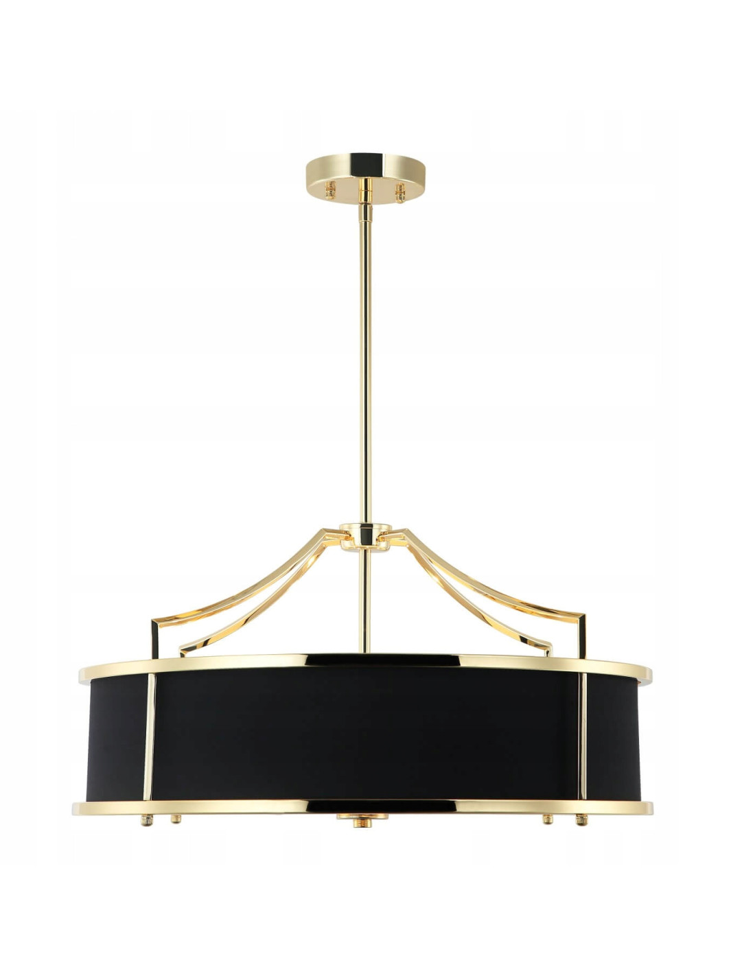 Design żyrandola oparty jest na eleganckiej złotej konstrukcji, która harmonijnie komponuje się z czarnym materiałowym kloszem. Dodatkowo, biały matowy szklany element wprowadza przyjemne rozproszenie światła, co czyni ten żyrandol nie tylko efektownym, ale także funkcjonalnym. To oświetlenie to synonim elegancji, wysokiej jakości i ponadczasowego designu.