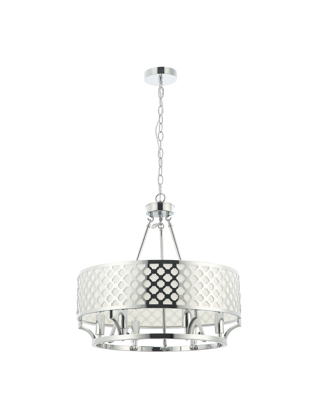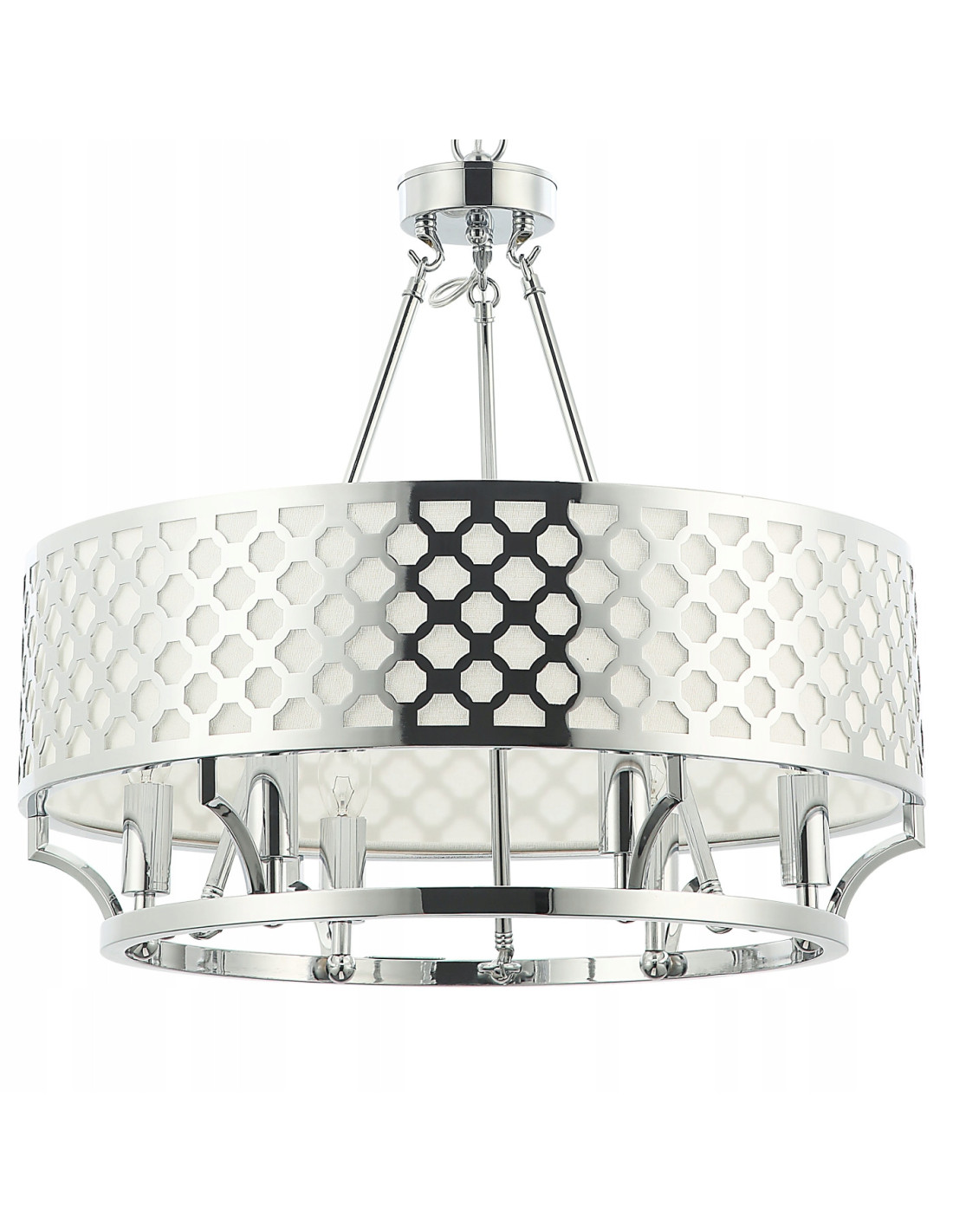 Żyrandol Verno Cromo to perfekcyjne połączenie elegancji i nowoczesności, które wzbogaci każdą przestrzeń. Jego chromowane wykończenie oraz geometryczny wzór klosza nadają mu unikalnego charakteru, czyniąc go doskonałym elementem dekoracyjnym do jadalni, salonu lub sypialni. Wnętrze lampy pomieści sześć źródeł światła, co zapewnia równomierne oświetlenie i przytulną atmosferę w domowych wnętrzach.